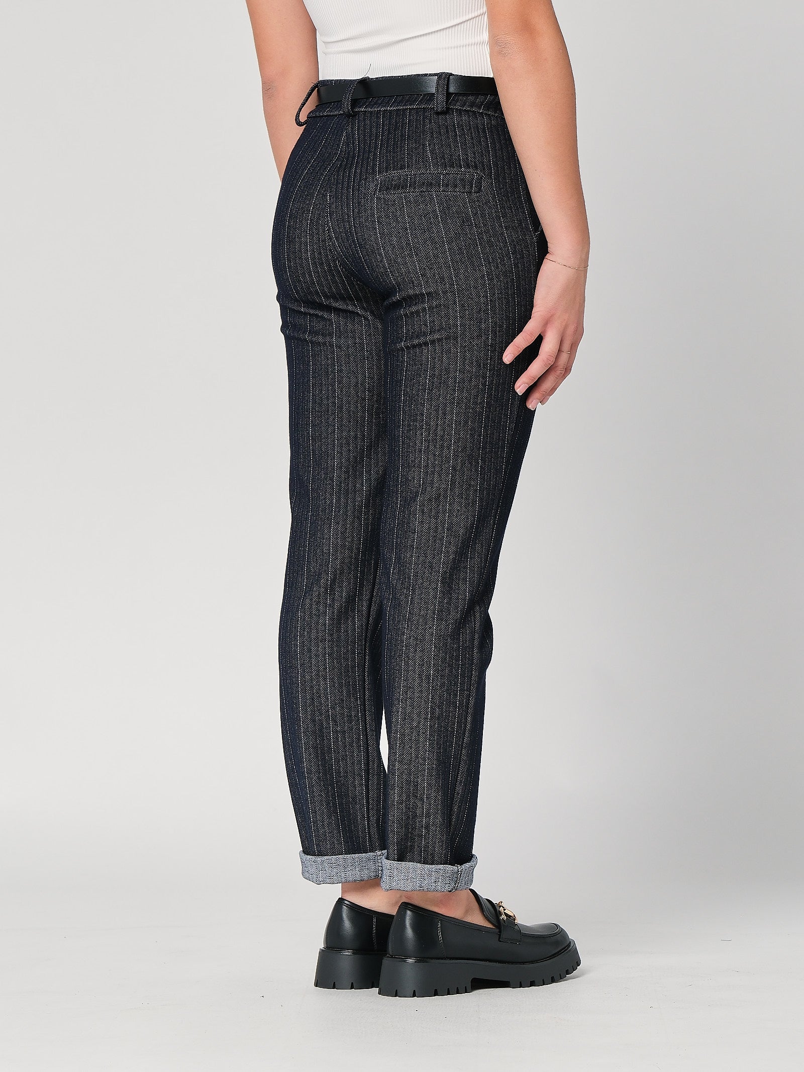 Dettaglio sartoriale: righe verticali e cintura elasticata