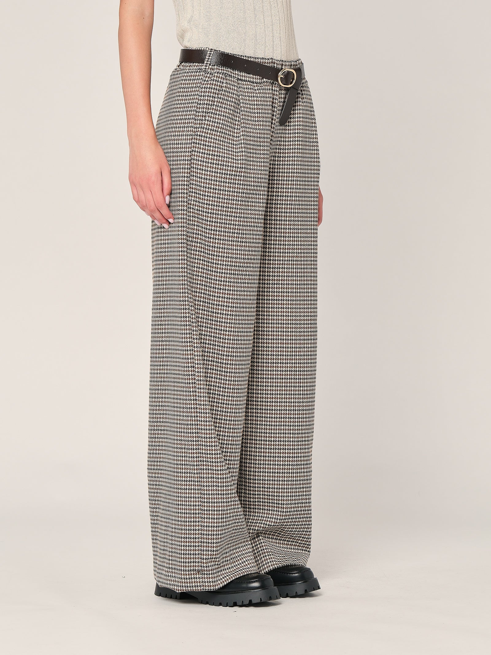 Pantalone dalla linea ampia in tessuto pied de poule, con cintura coordinata ed elastico in vita che assicura comfort e vestibilità perfetta.