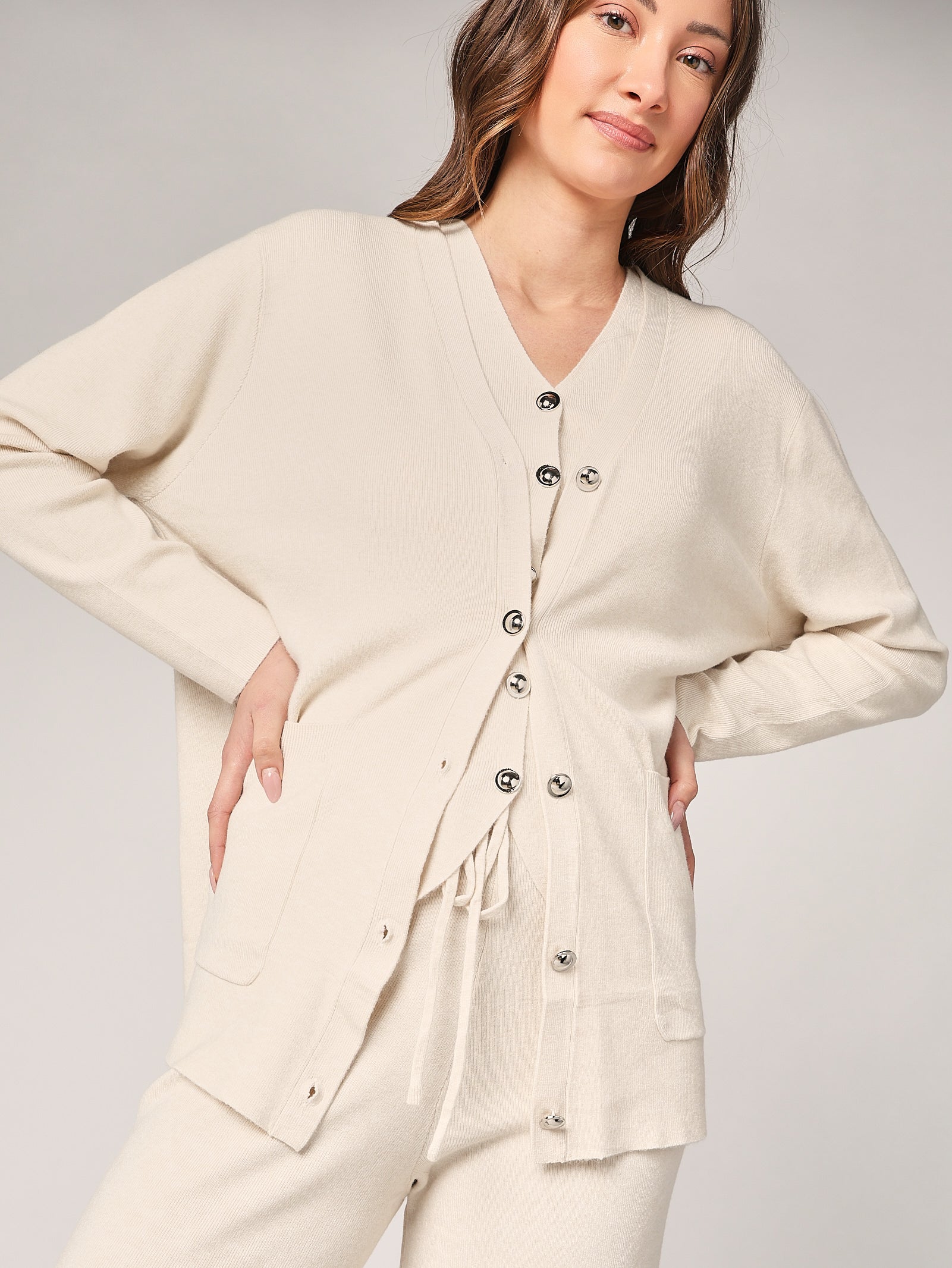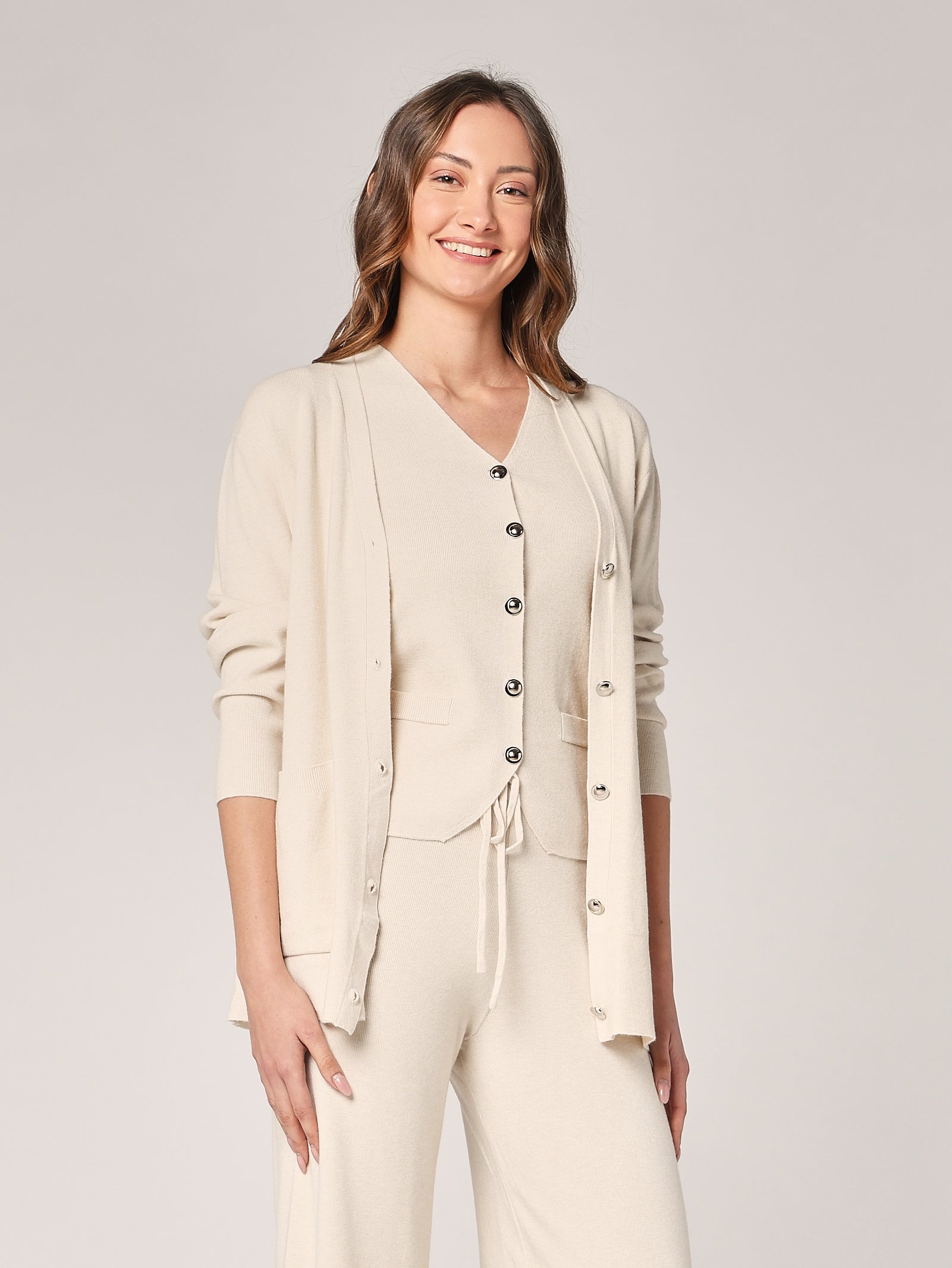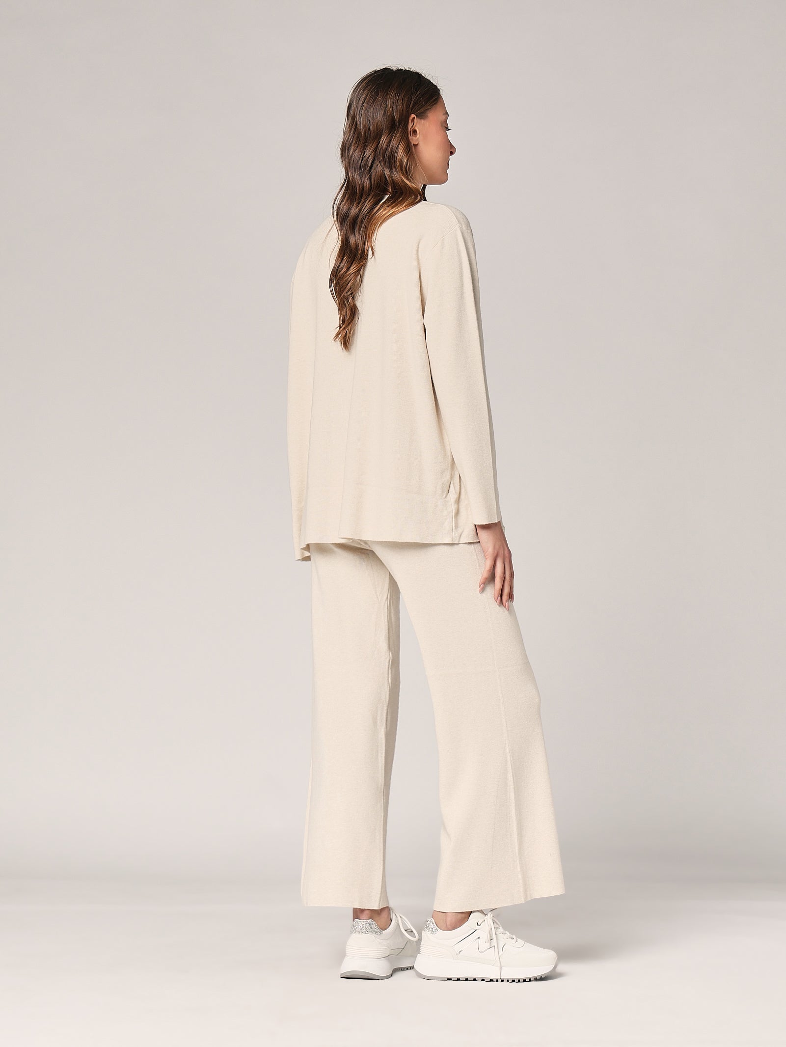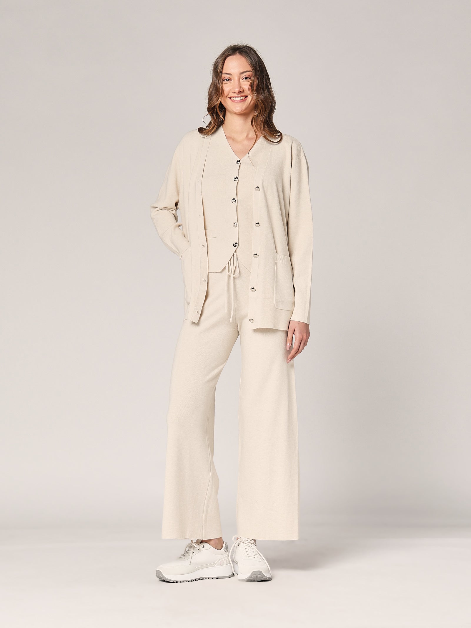 Ein eleganter Dreiteiler bestehend aus Oberteil, Hose und passender Weste für einen raffinierten und zeitlosen Look. Die klaren Linien und der fließende Schnitt verleihen Balance und Weiblichkeit, während das harmonische Design ihn perfekt für vielseitige Outfits macht.