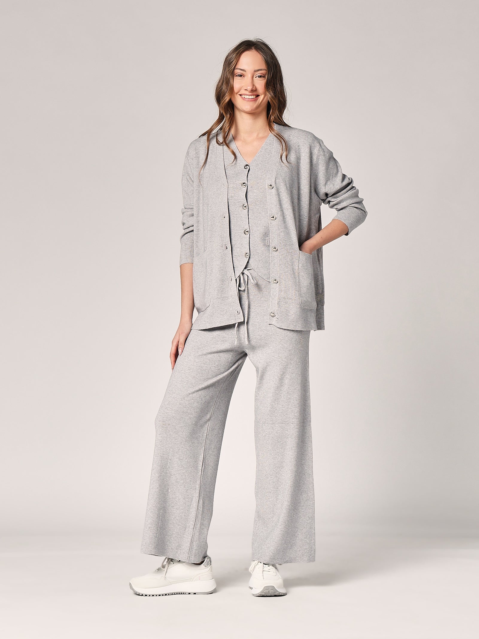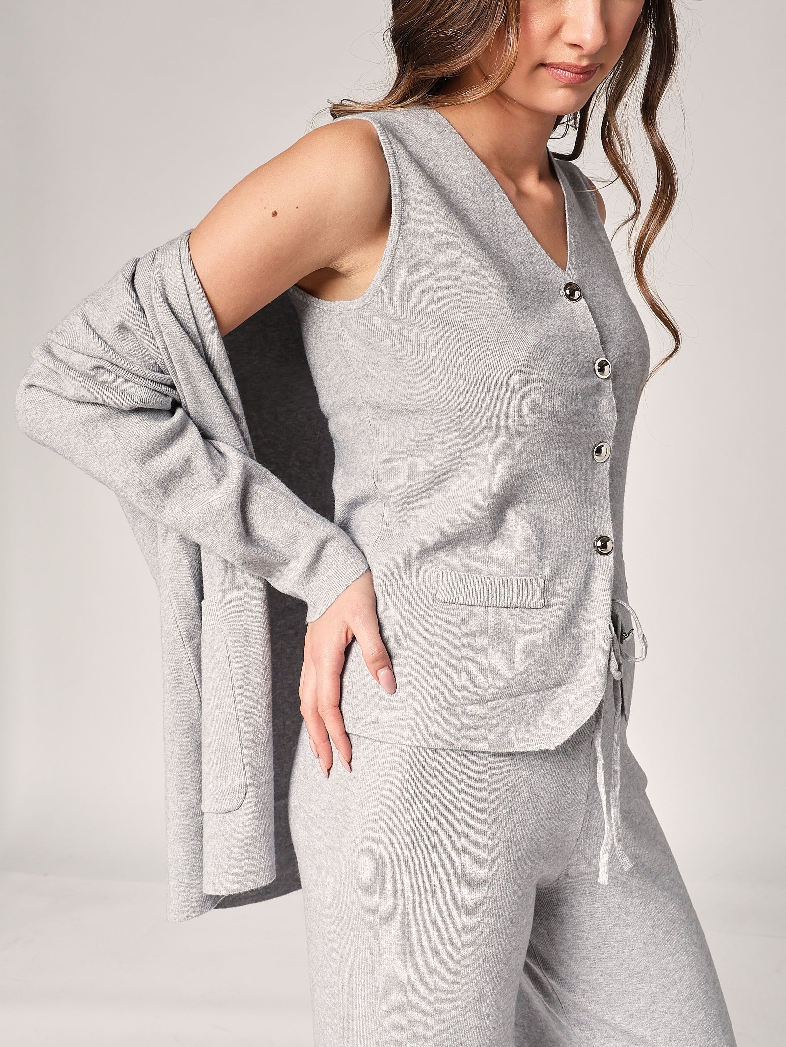 Dieser aufeinander abgestimmte Dreiteiler ist für alle, die einen eleganten und gleichzeitig praktischen Stil lieben. Die Weste verleiht Oberteil und Hose eine moderne Note und sorgt für ein harmonisches und optisch ansprechendes Outfit. Die Teile lassen sich auch einzeln tragen und ermöglichen so immer wieder neue Looks.