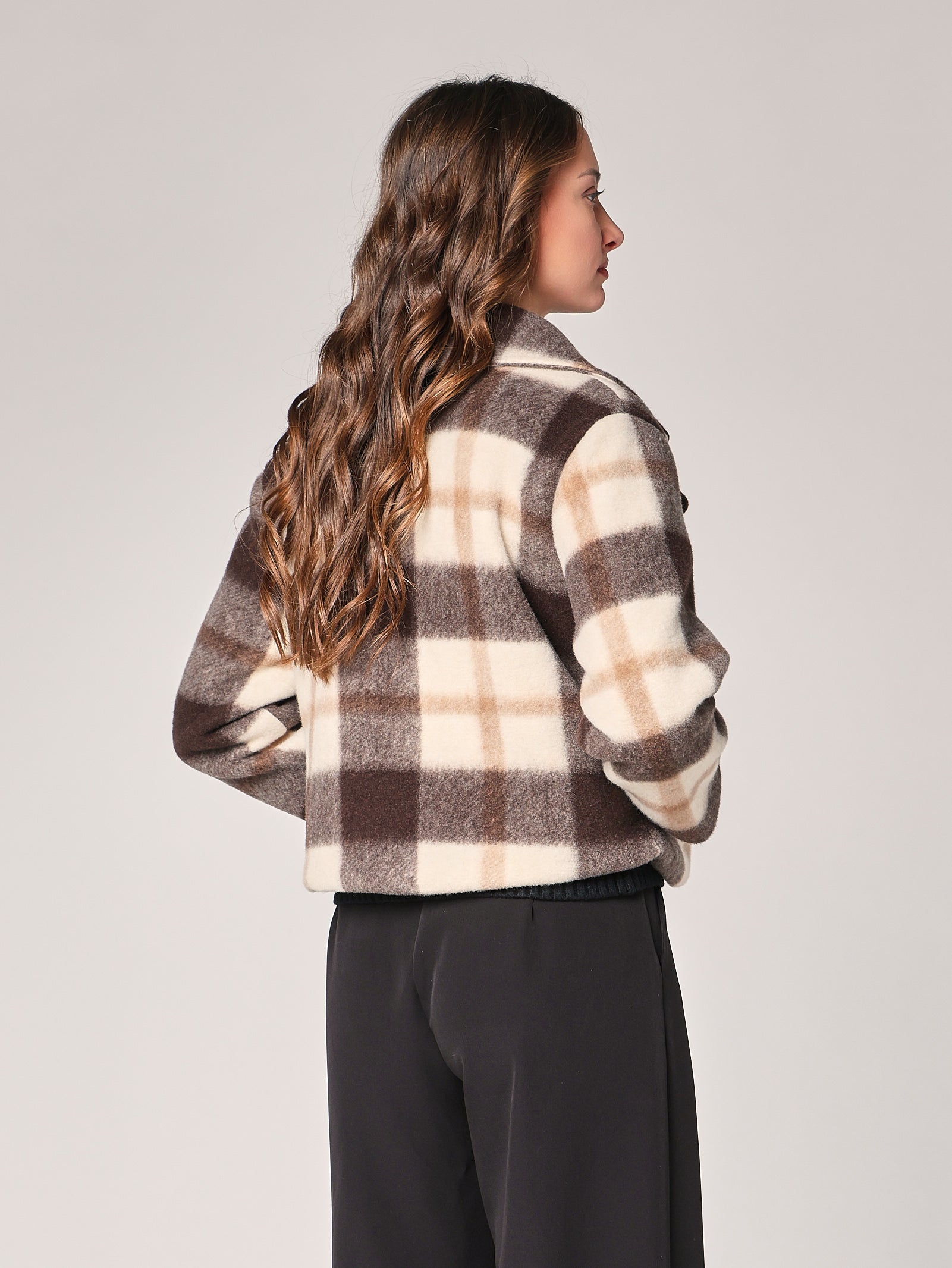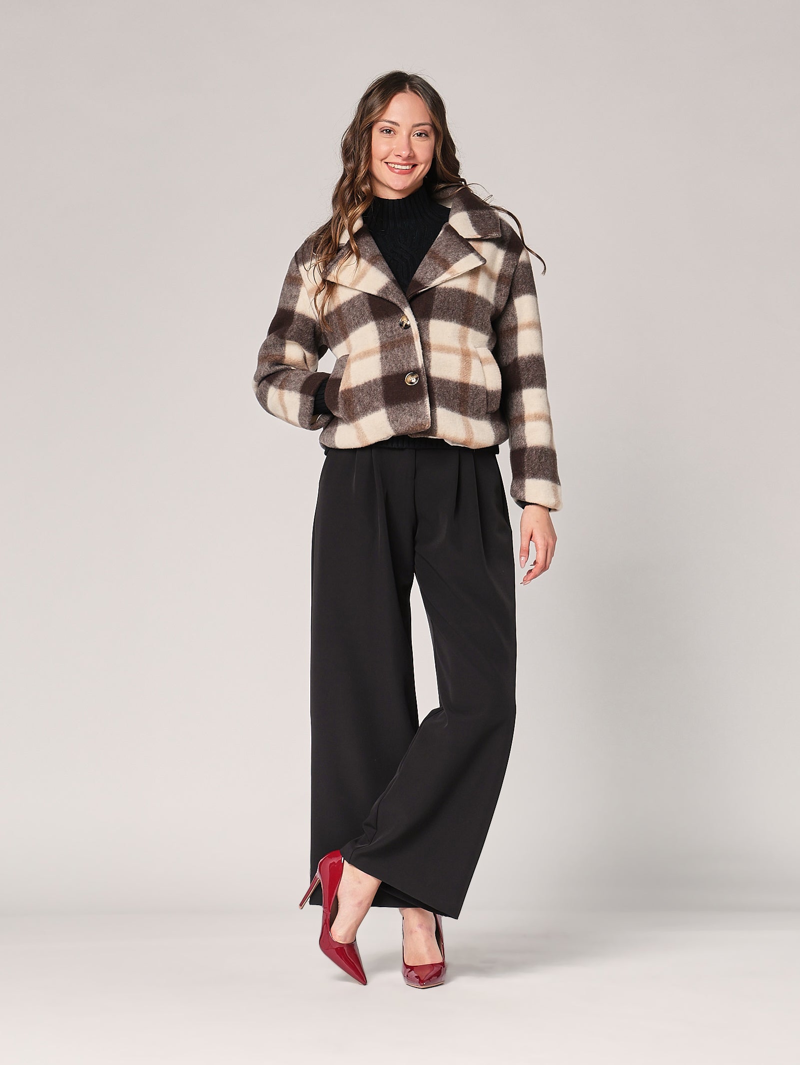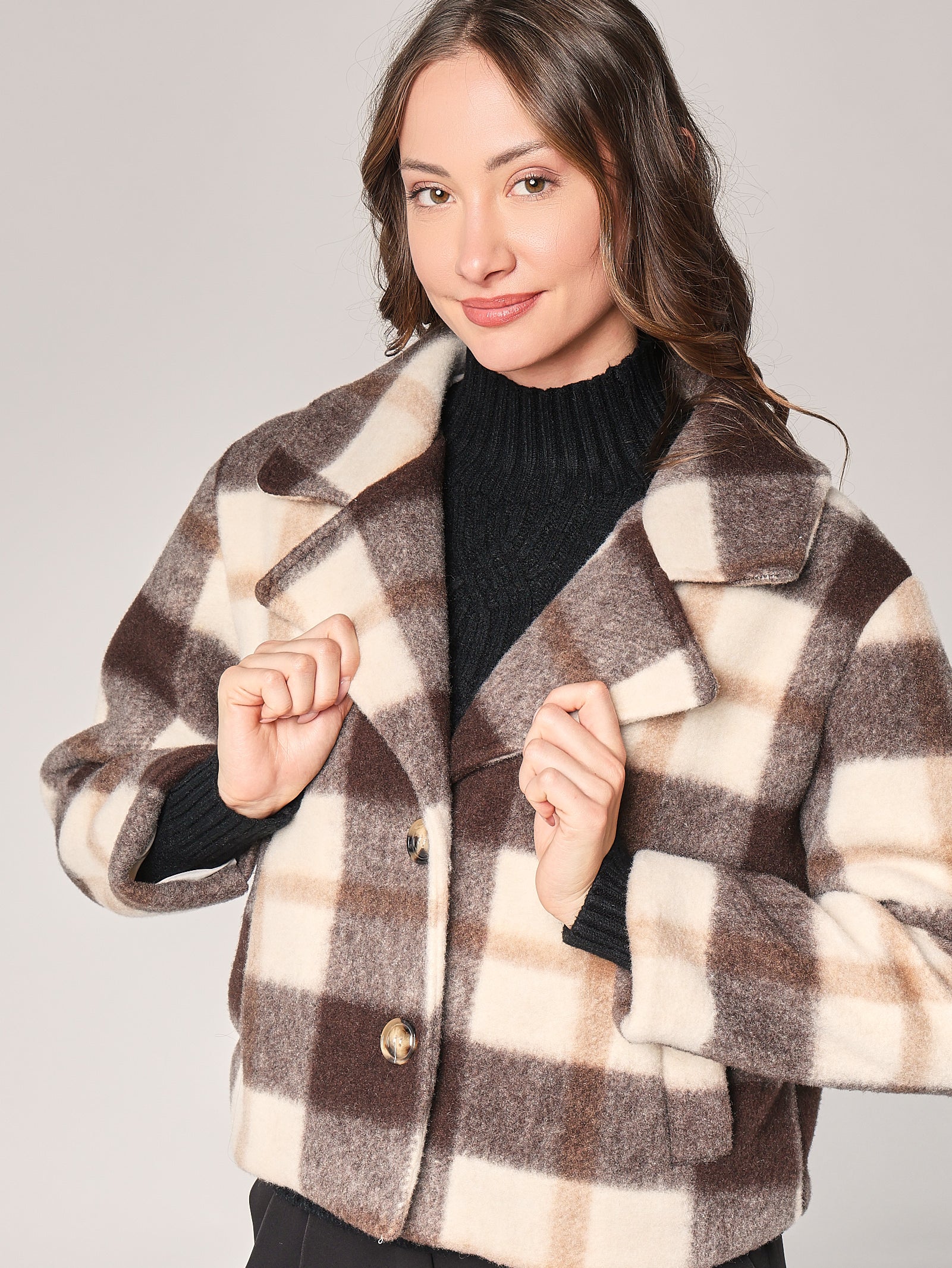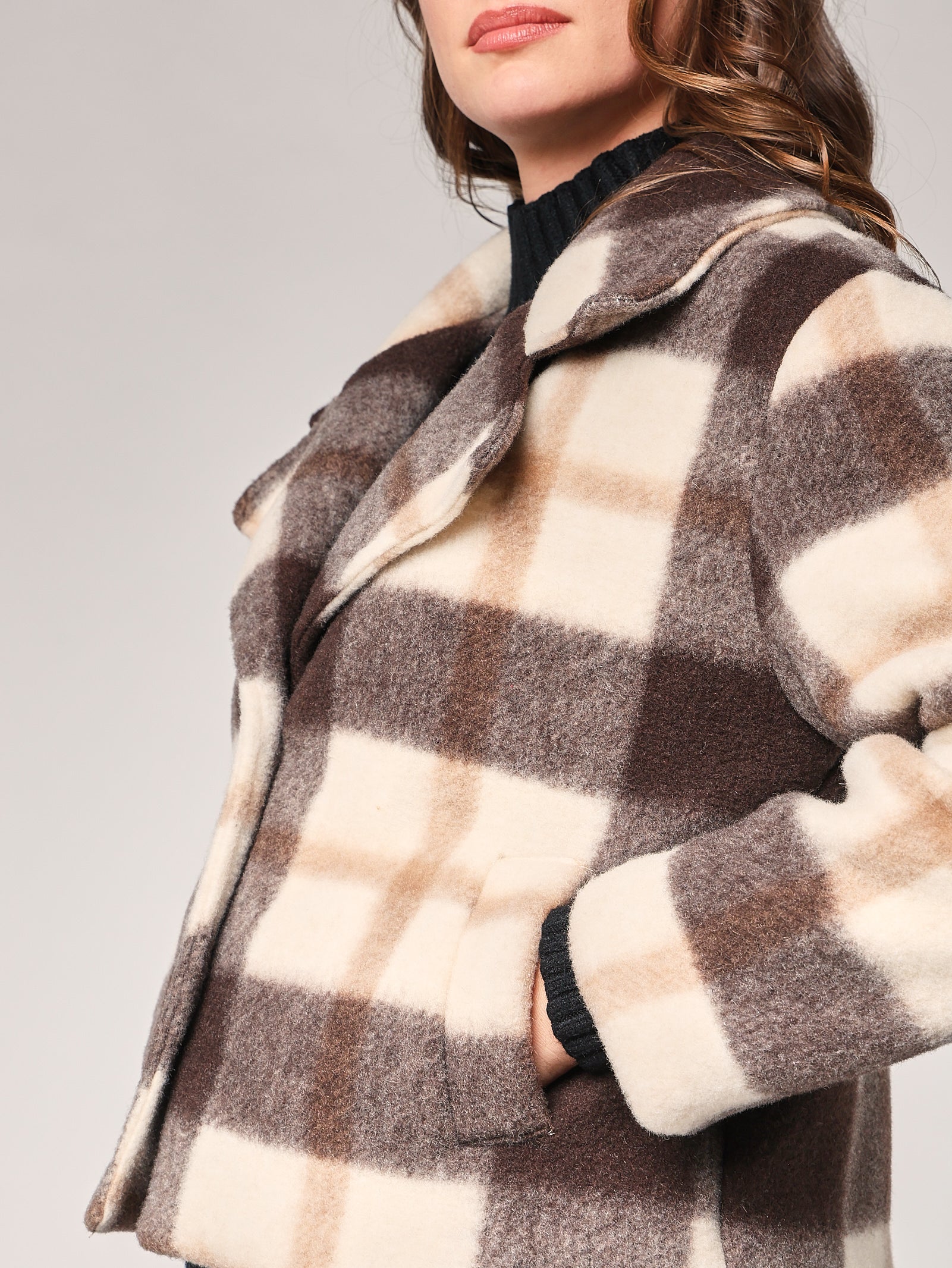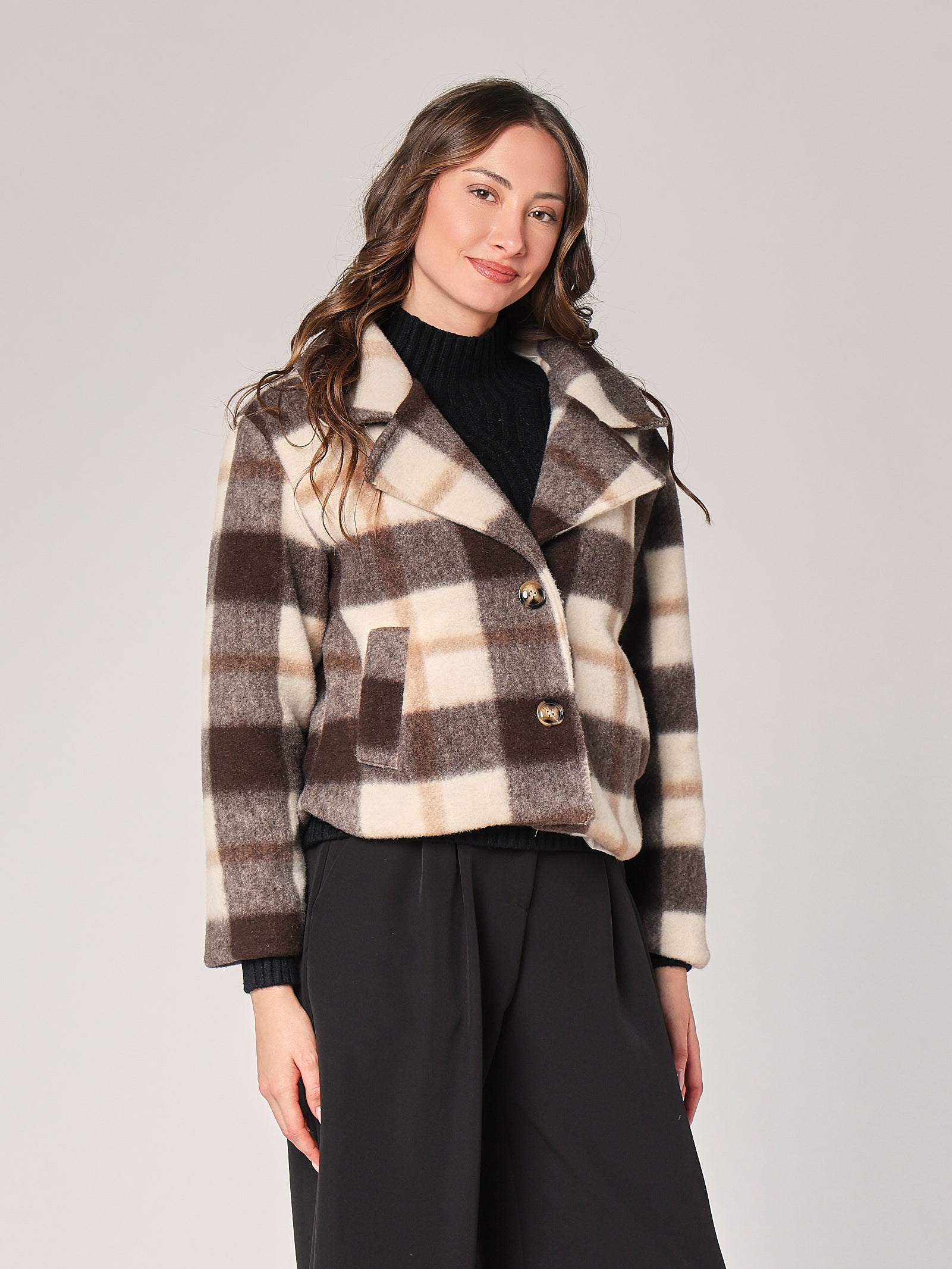 Warme Farbtöne, ein markanter Schnitt und die perfekte Mischung aus Eleganz und Charakter. Dieser kurze, kakaofarbene Karomantel setzt dezente Akzente und verleiht selbst schlichten Outfits einen Hauch von Raffinesse. Einfach überziehen und schon fühlen Sie sich bereit, den Tag zu erobern.