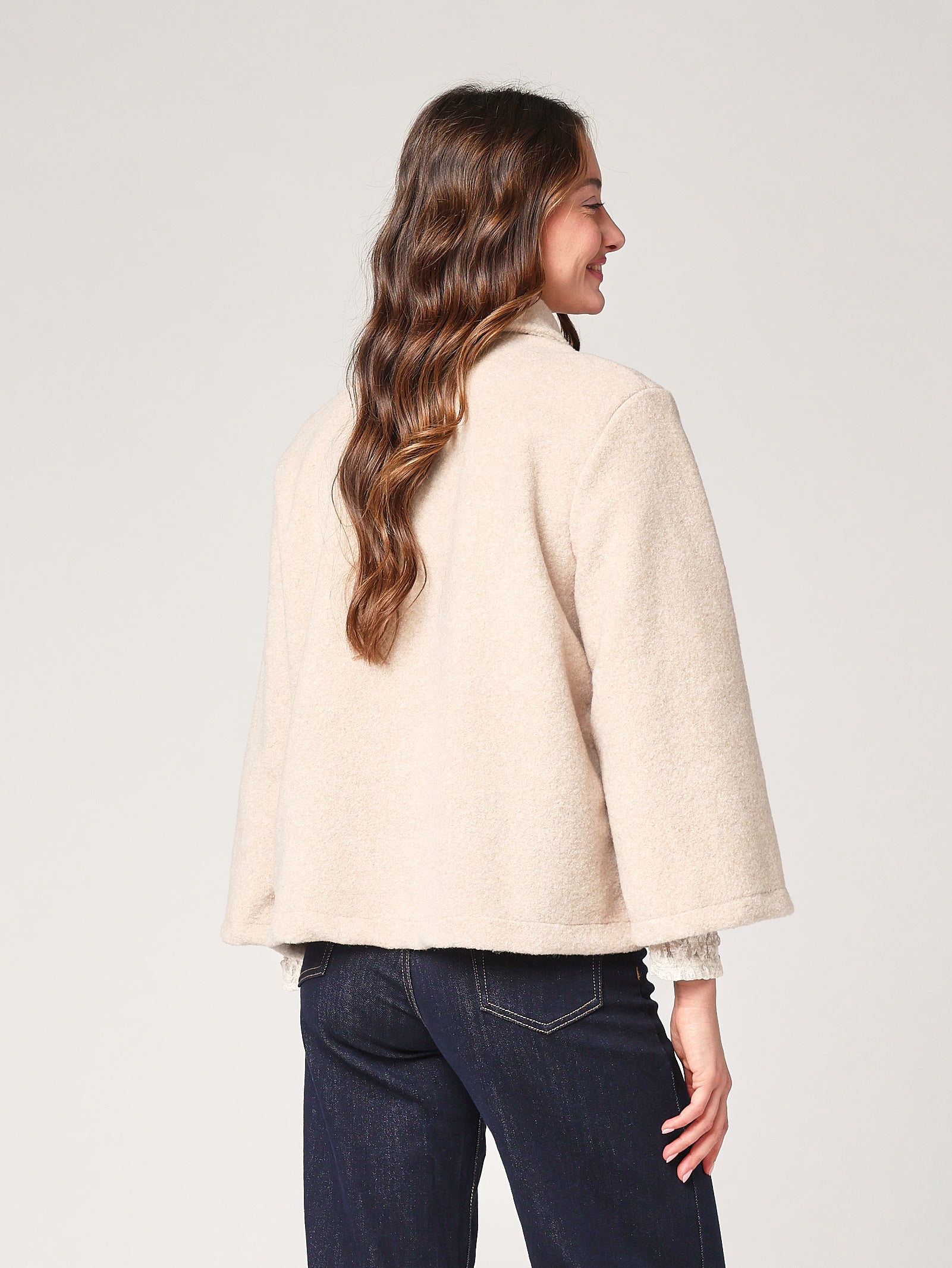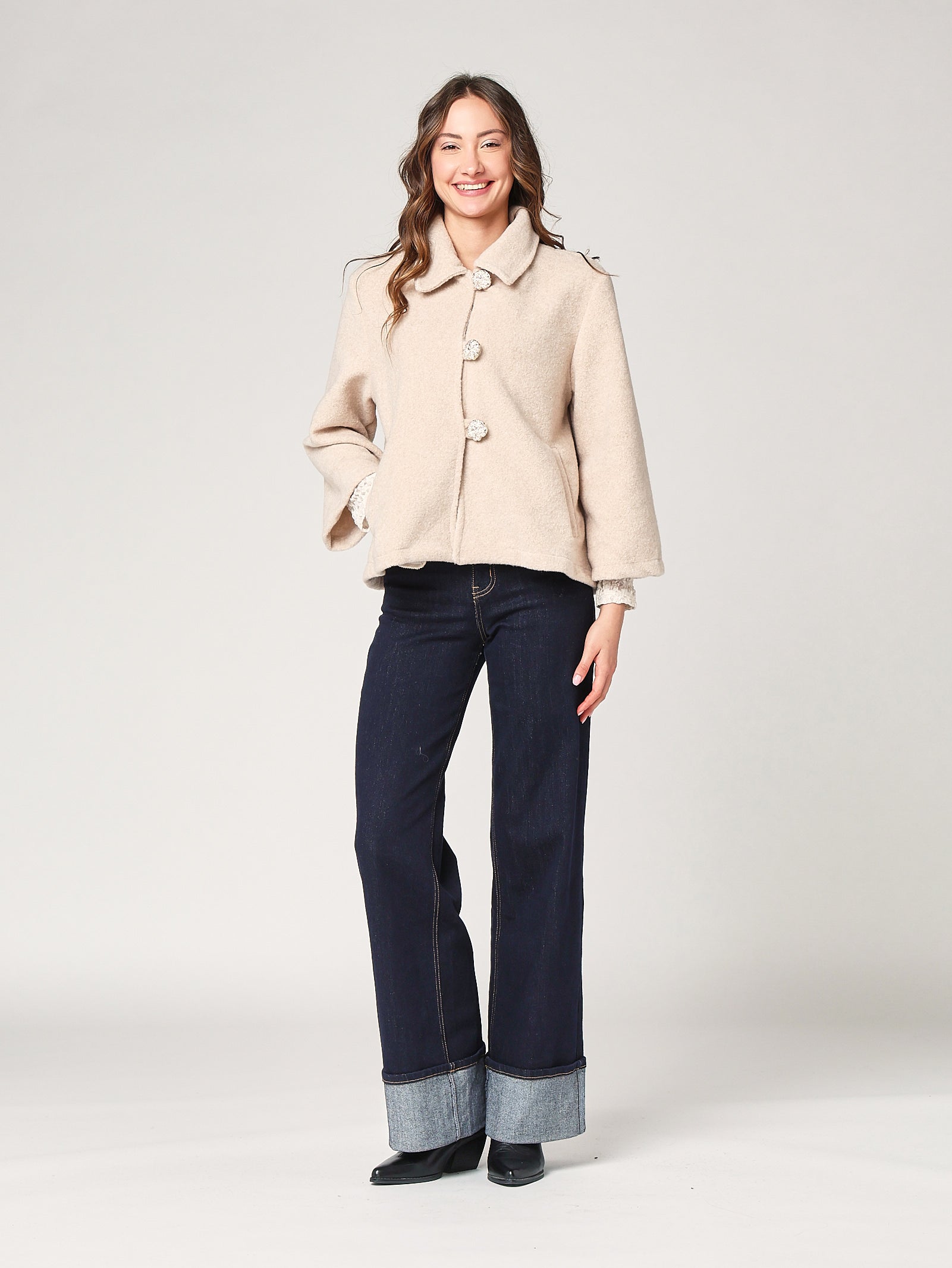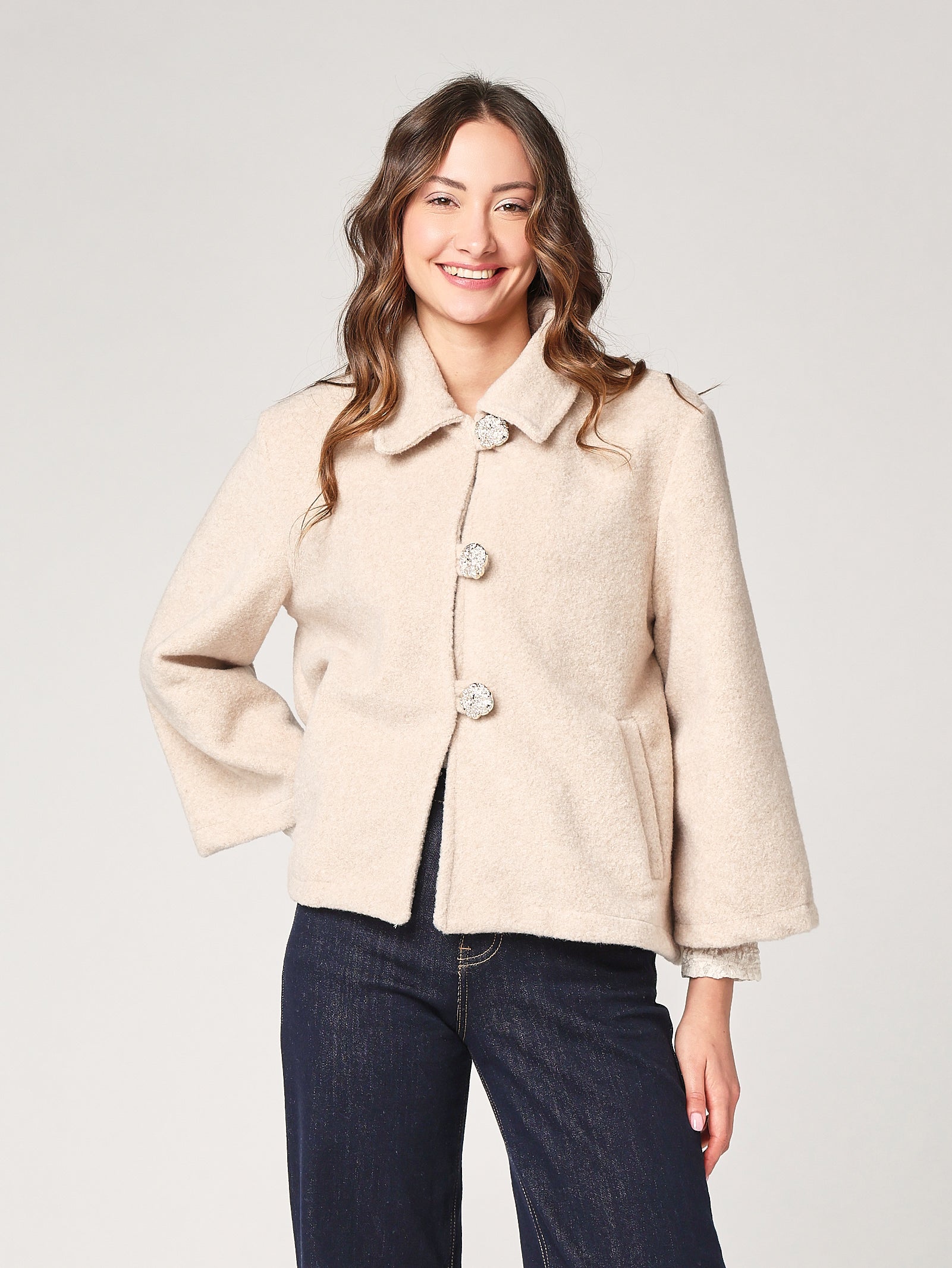 Cappotto corto a tre bottoni dal fascino intramontabile. Il taglio pulito e la linea leggermente svasata donano eleganza e femminilità, mentre la lunghezza media lo rende perfetto per completare ogni outfit, dal più casual al più sofisticato.