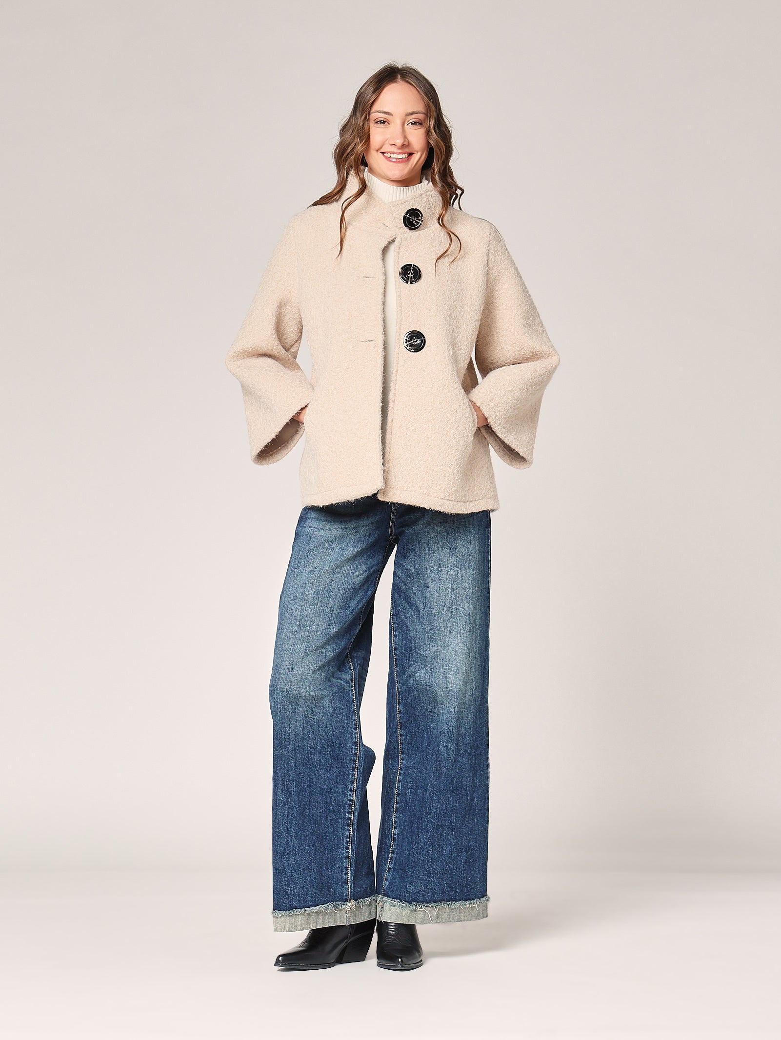 Dieser kurze Mantel mit Knöpfen ist ein elegantes und vielseitiges Modell, perfekt für die Übergangszeit. Der gerade Schnitt schmeichelt der Figur, während die Knopfleiste vorne für einen raffinierten Akzent sorgt. Warm und dennoch leicht – der ideale Begleiter für makellose City-Looks.