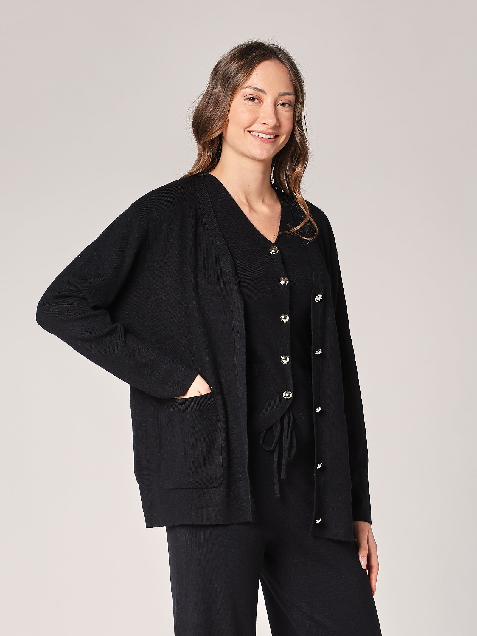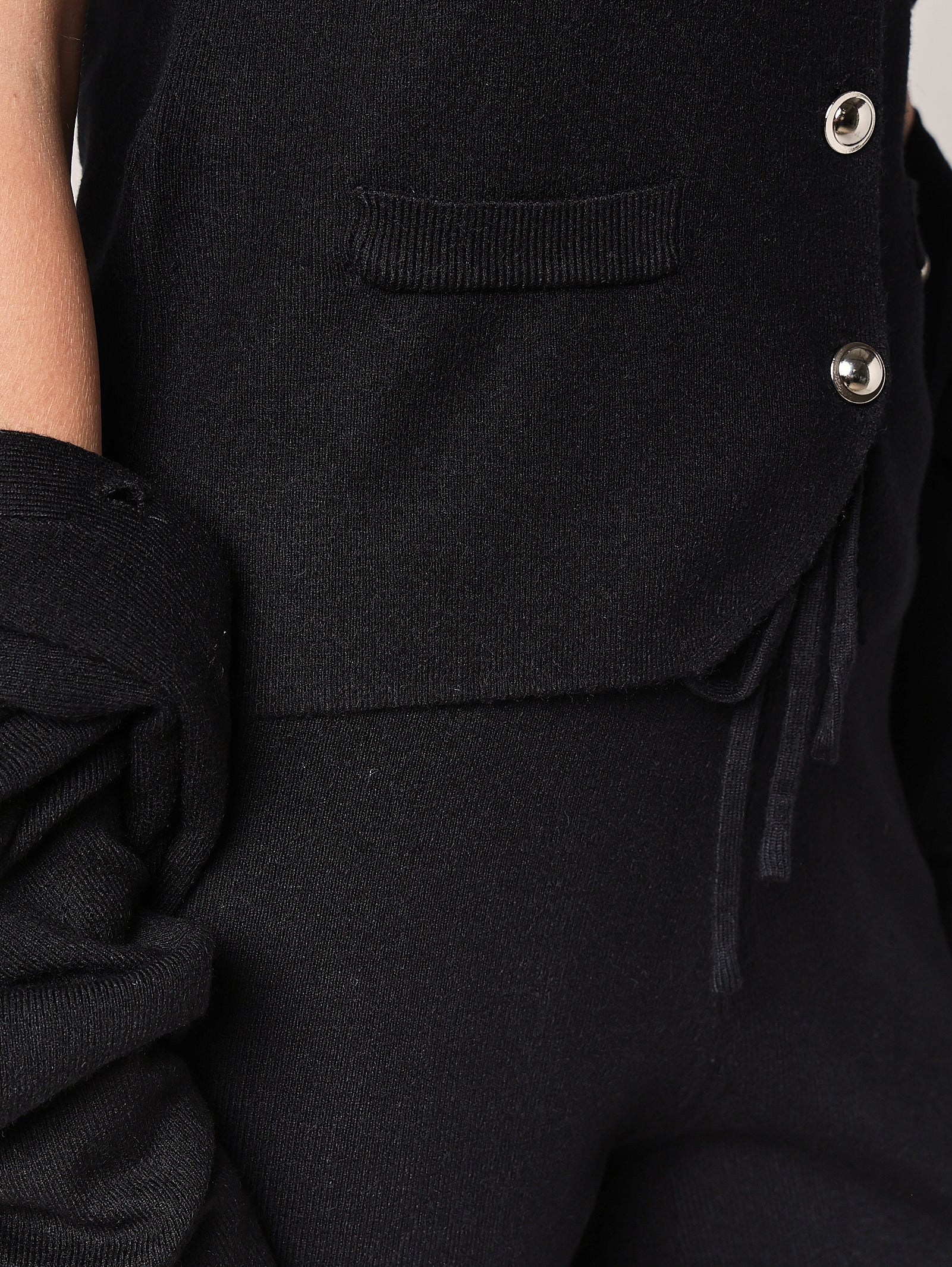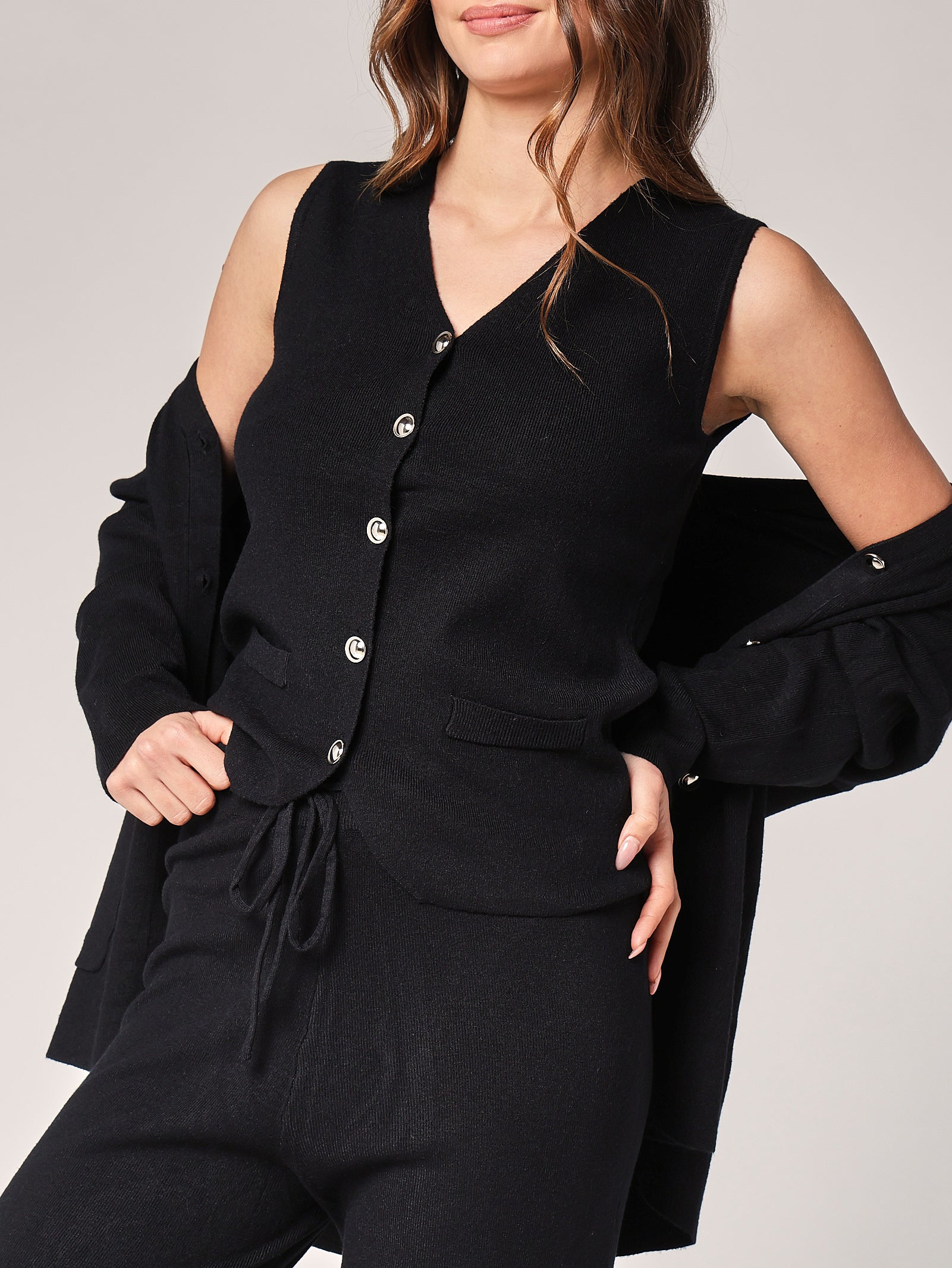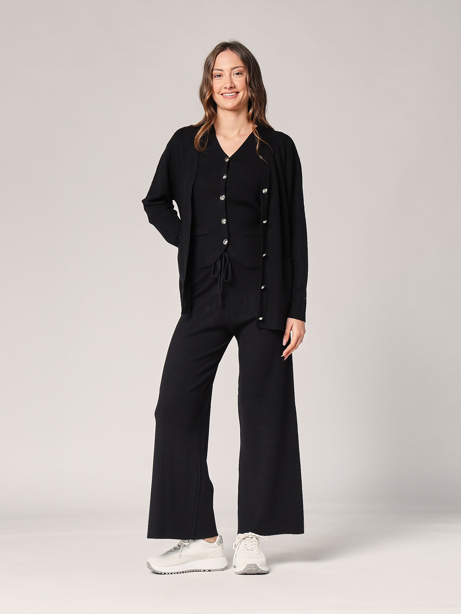 Ein eleganter Dreiteiler bestehend aus Oberteil, Hose und passender Weste für einen anspruchsvollen und zeitlosen Look. Das strukturierte Design und der fließende Schnitt erzeugen eine harmonische Silhouette, während die drei aufeinander abgestimmten Teile vielfältige Outfit-Möglichkeiten bieten – von formell bis lässig-schick.