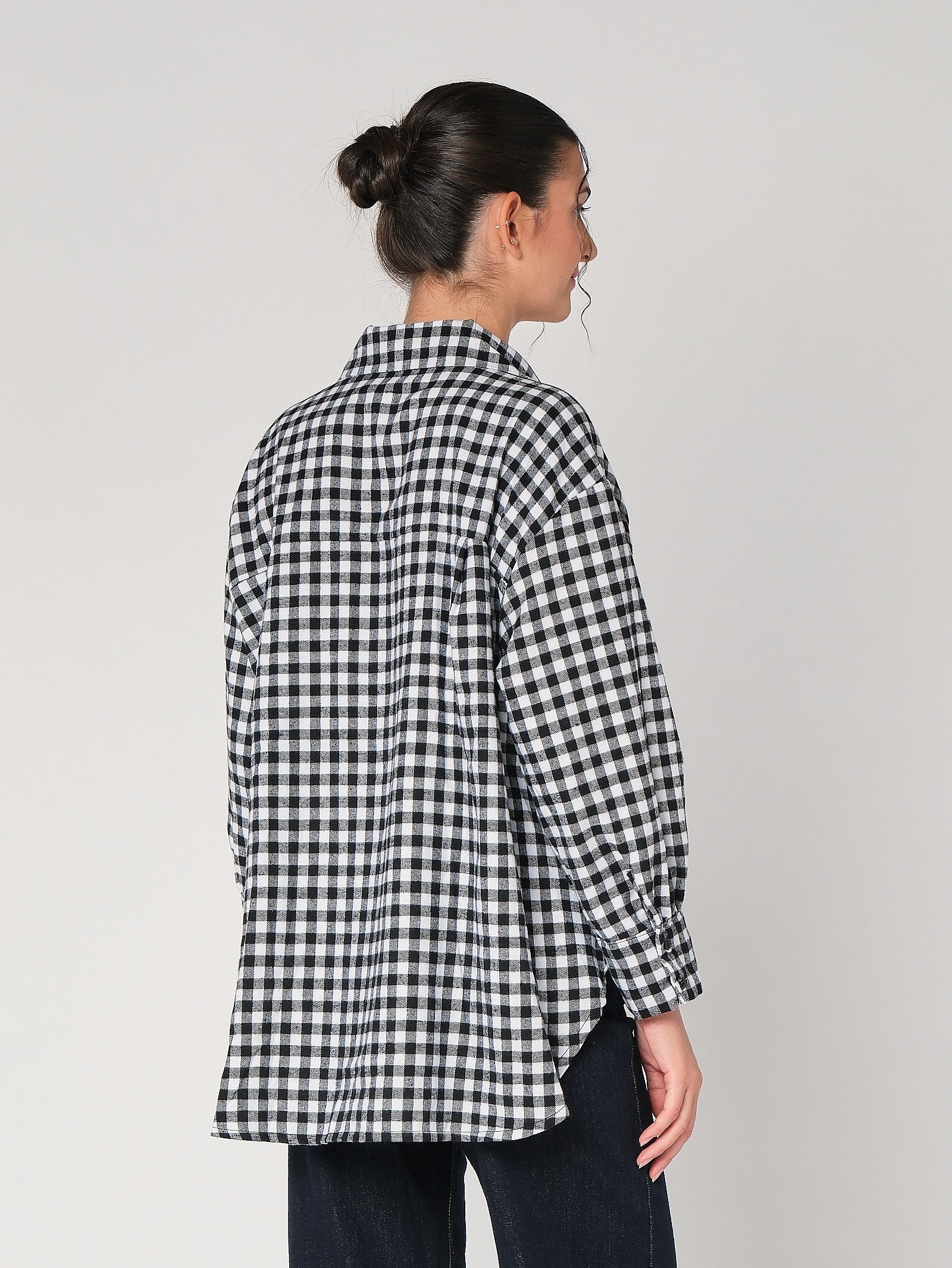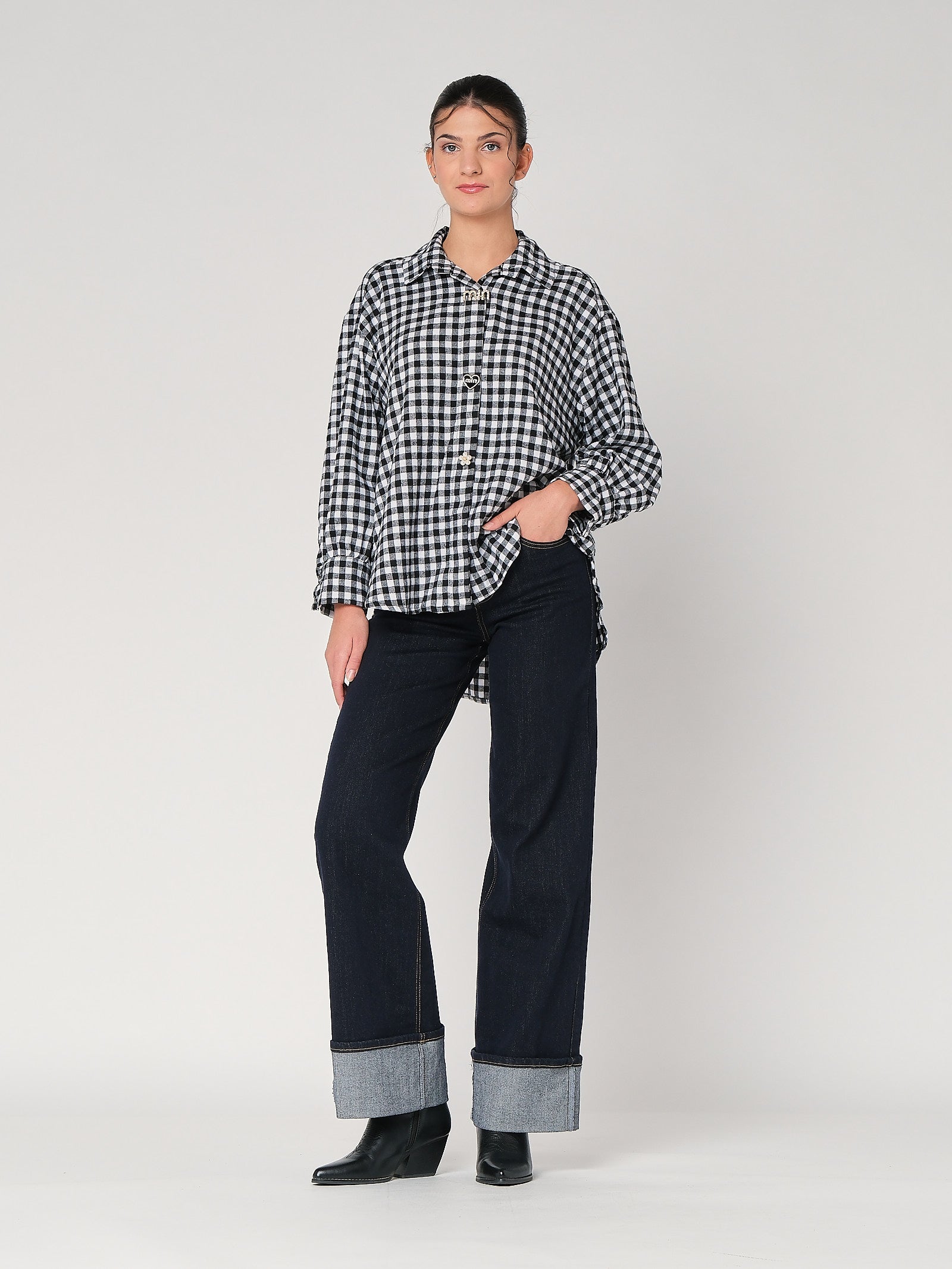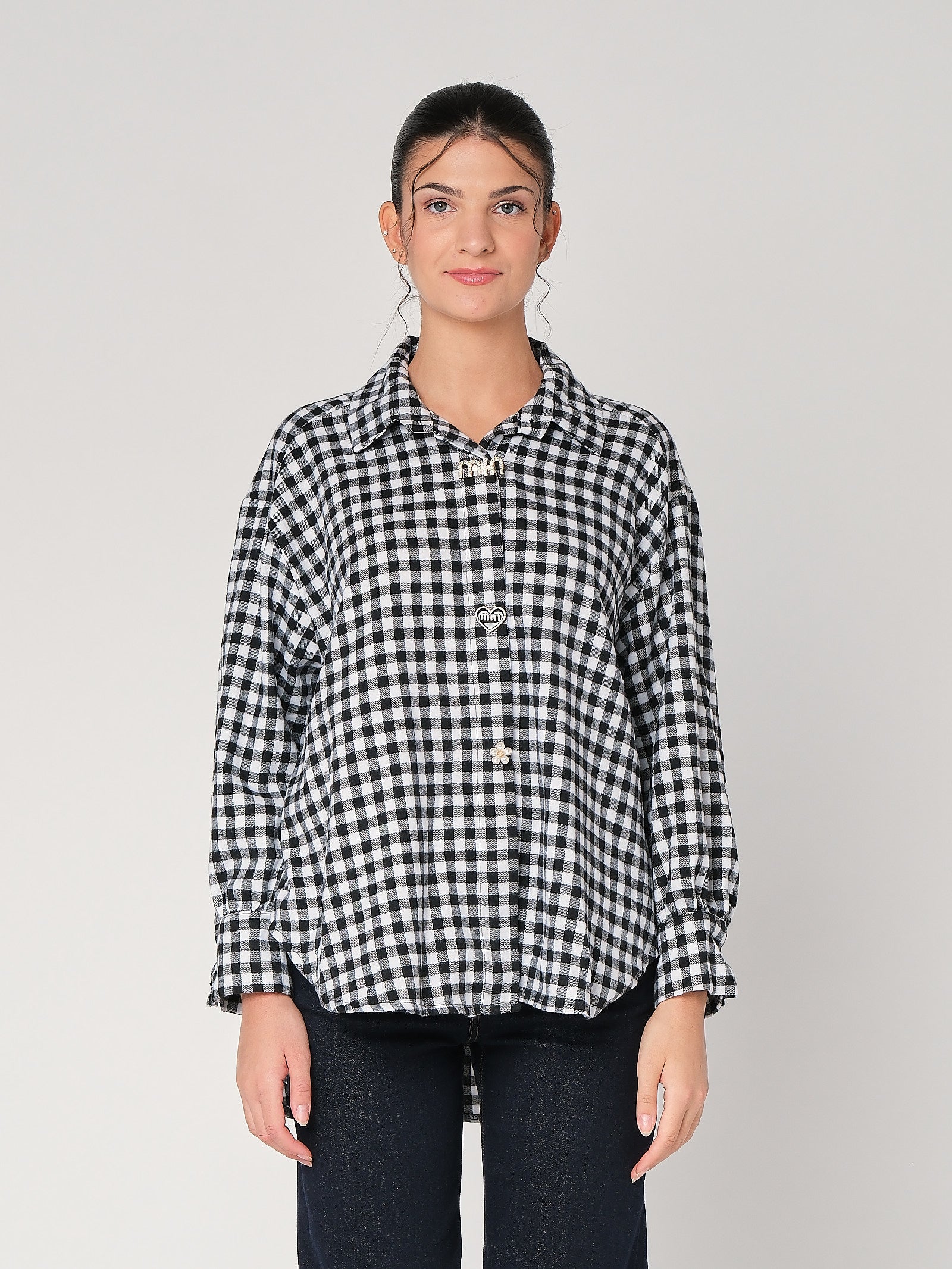 La camicia a quadretti con spille è il dettaglio cool che sistema il look in un attimo: taglio pulito, quadrettatura che dà ritmo, spille decorative che alzano il tono senza esagerare. È una camicia donna facile da indossare, resta ordinata da sola su denim e diventa subito camicia elegante sotto giacca. Mood curato, zero sbatti: entri, si nota, fine.