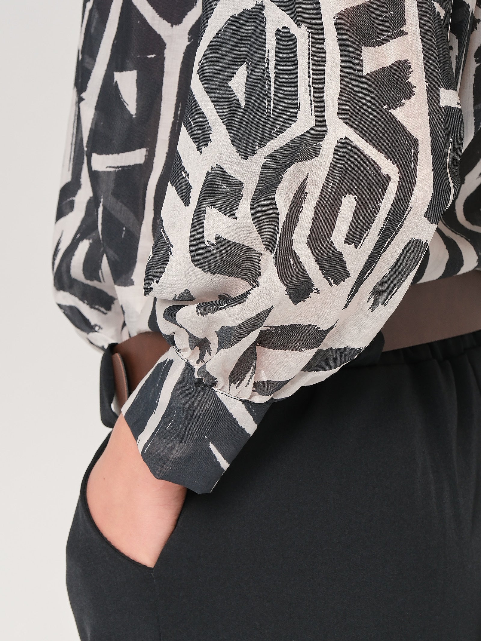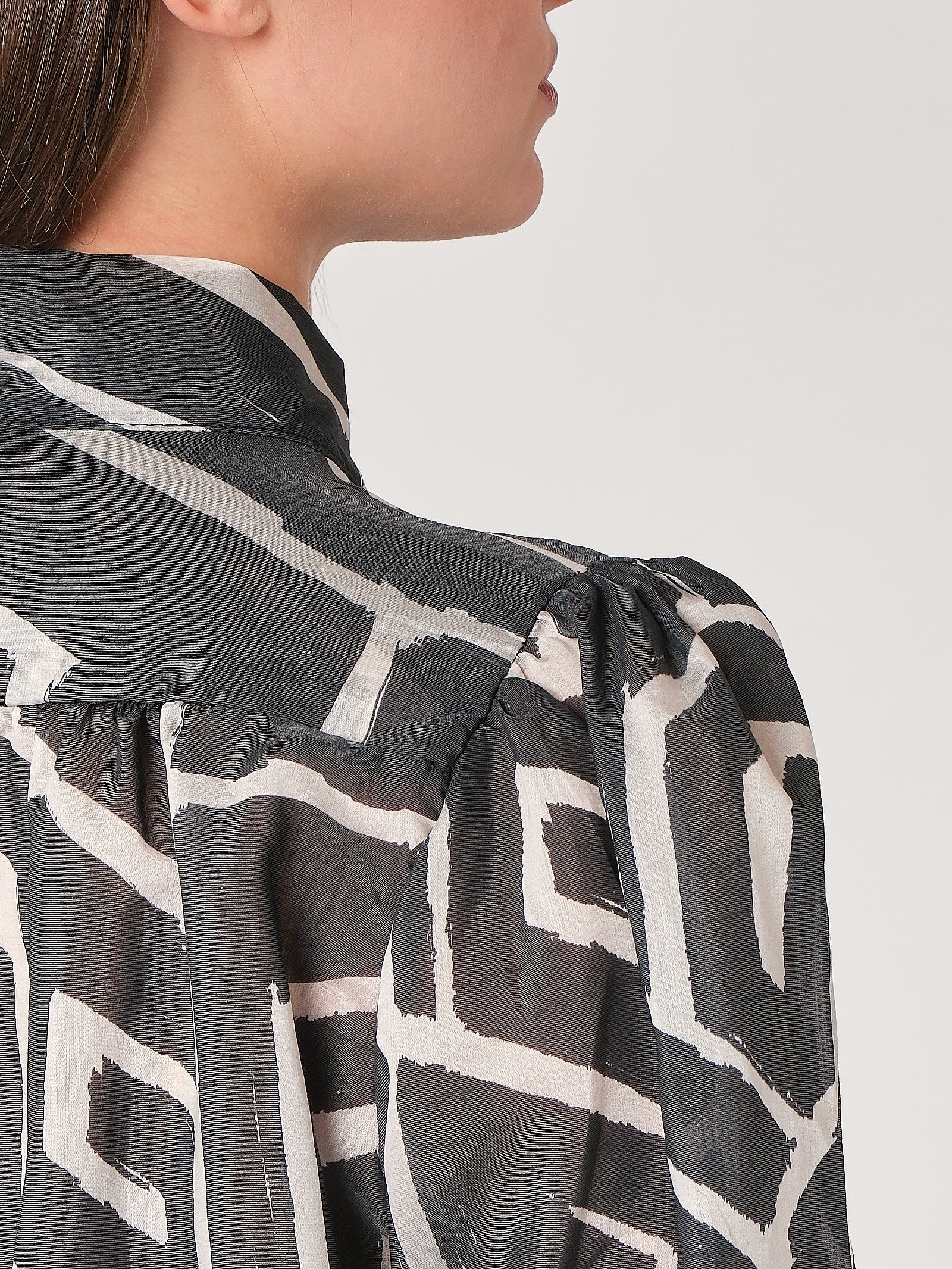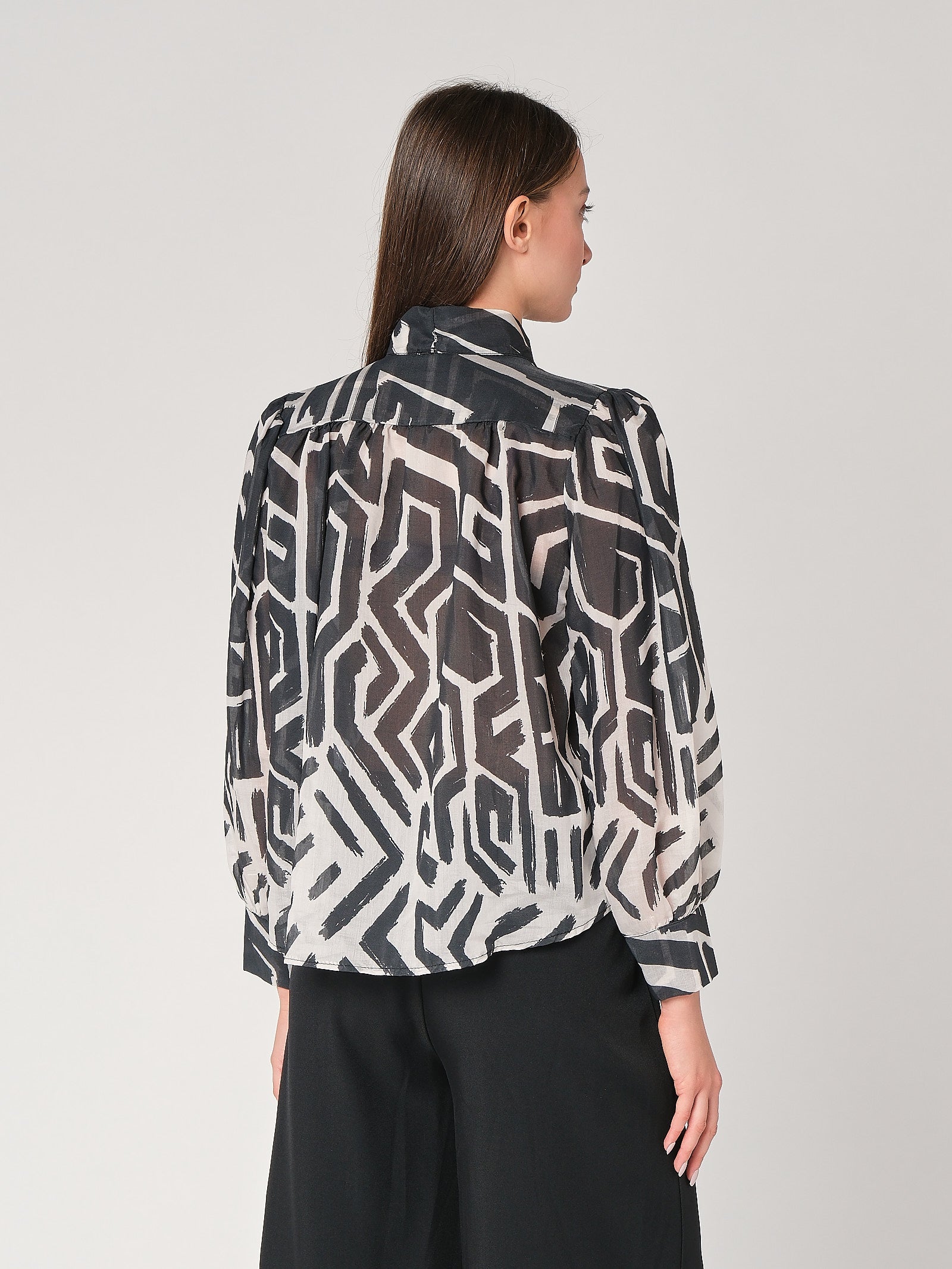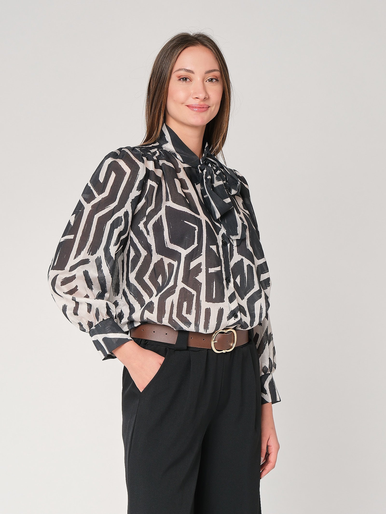 Camicia leggera a maniche lunghe con fantasia astratta, caratterizzata da un elegante fiocco al collo che aggiunge un dettaglio sofisticato. Linea morbida con polsini elasticizzati e chiusura frontale con bottoni nascosti, ideale per look raffinati e contemporanei.