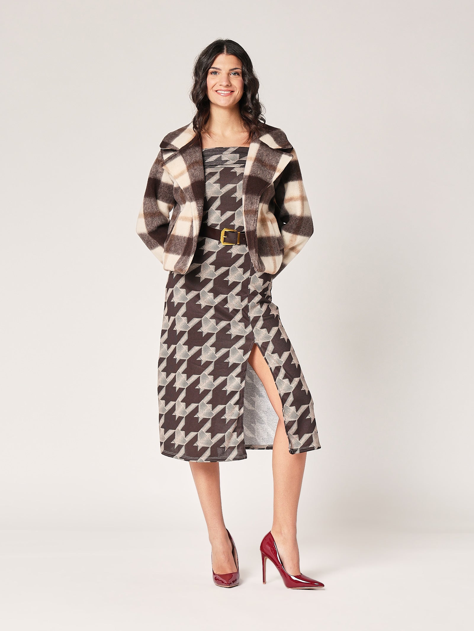 Tono caldo, taglio deciso e quel mix perfetto tra bon ton e carattere. Il cappotto corto a quadretti cacao si fa notare con discrezione, aggiungendo un tocco sofisticato anche ai look più semplici. Ti basta indossarlo per sentirti subito pronta a conquistare la giornata.