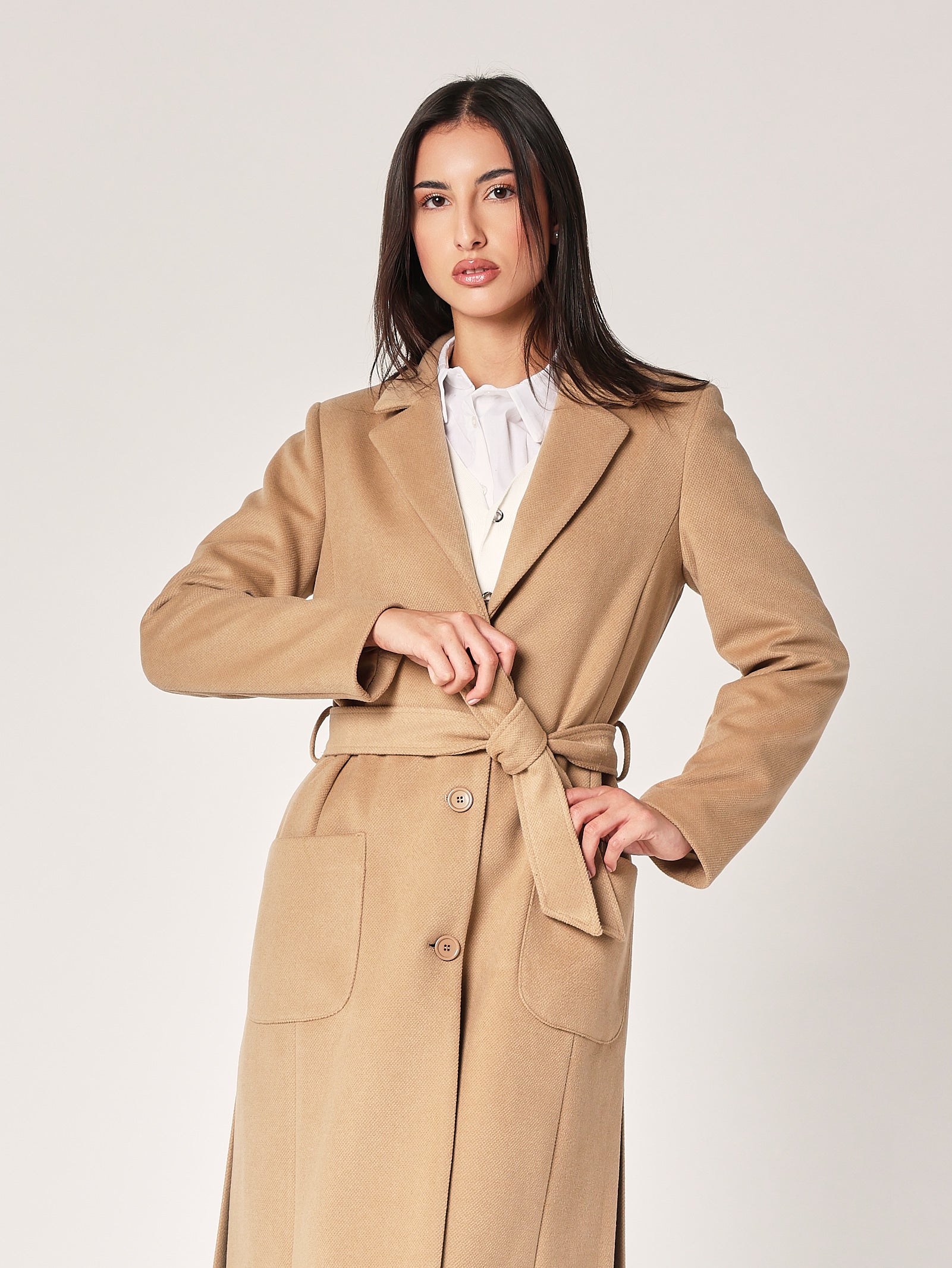 Caldo, chic e sempre di tendenza. Il cappotto cammello è il must di ogni stagione, ma questo con spacchi laterali aggiunge movimento e personalità. Da indossare aperto con stivali o chiuso con cintura, per uno stile deciso ma morbido.