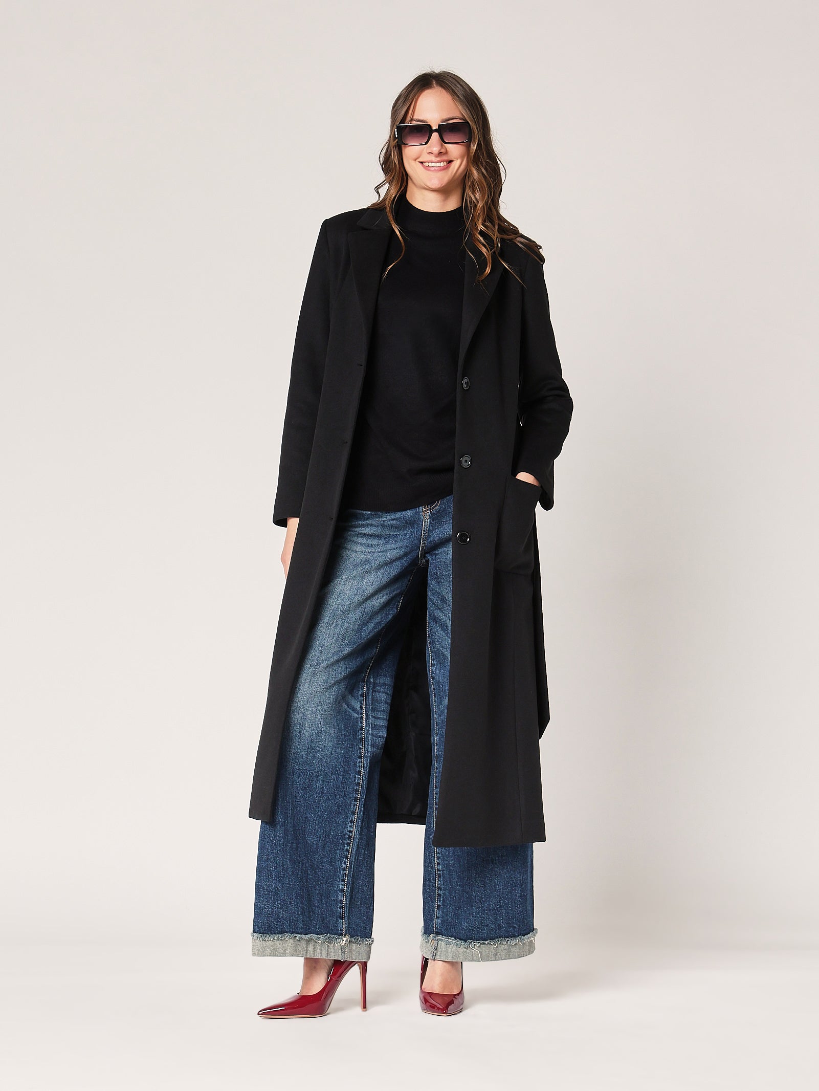 Lungo, fluido e pieno di carattere. Il cappotto con spacchi laterali nero è quel pezzo che dona subito presenza, senza bisogno di gridare. Ti accompagna ovunque, dal lavoro alla sera, con quell’eleganza pratica che solo le monelle sanno portare.