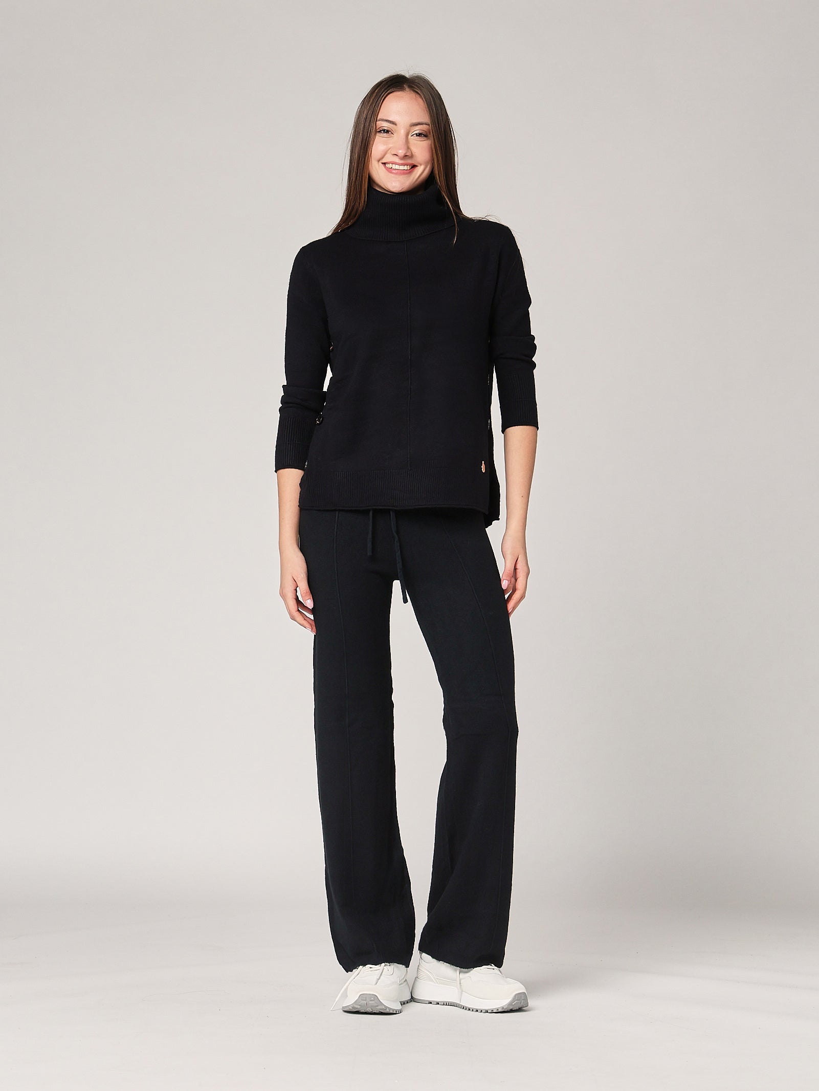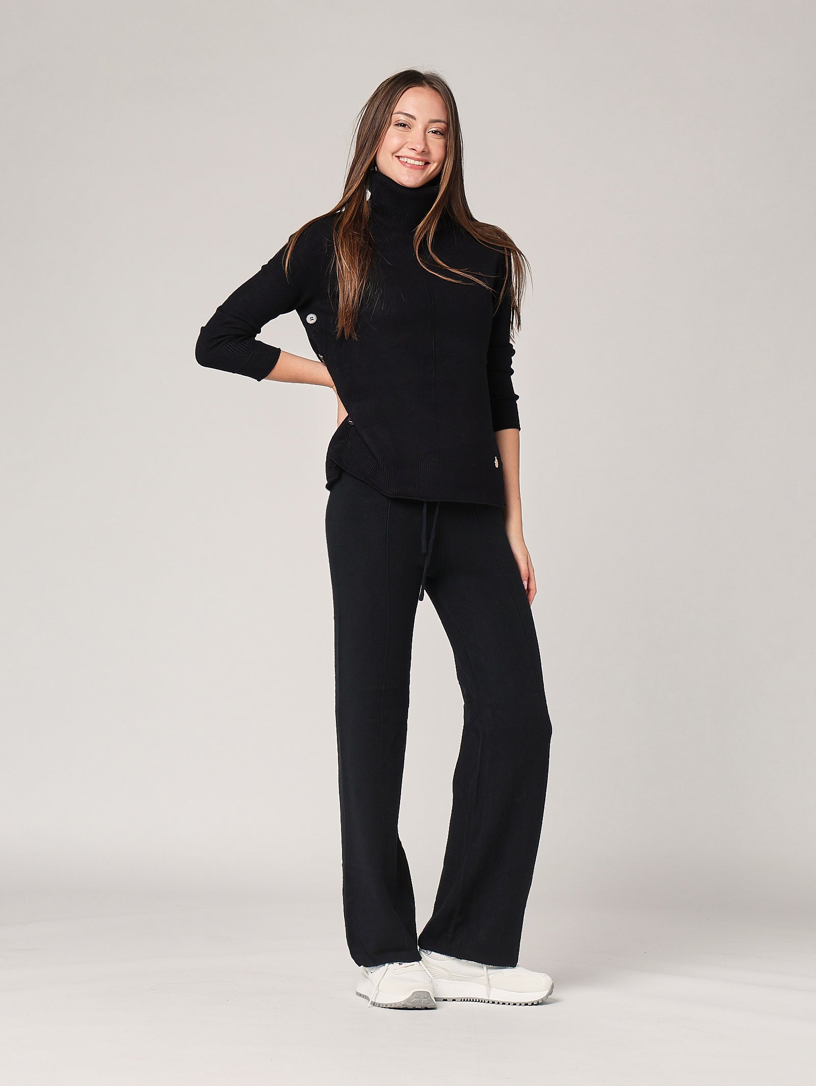 Completo due pezzi con bottoni tono su tono, un set semplice e raffinato che si adatta con eleganza a ogni contesto. La texture fluida e la linea equilibrata lo rendono un capo chiave per la stagione.