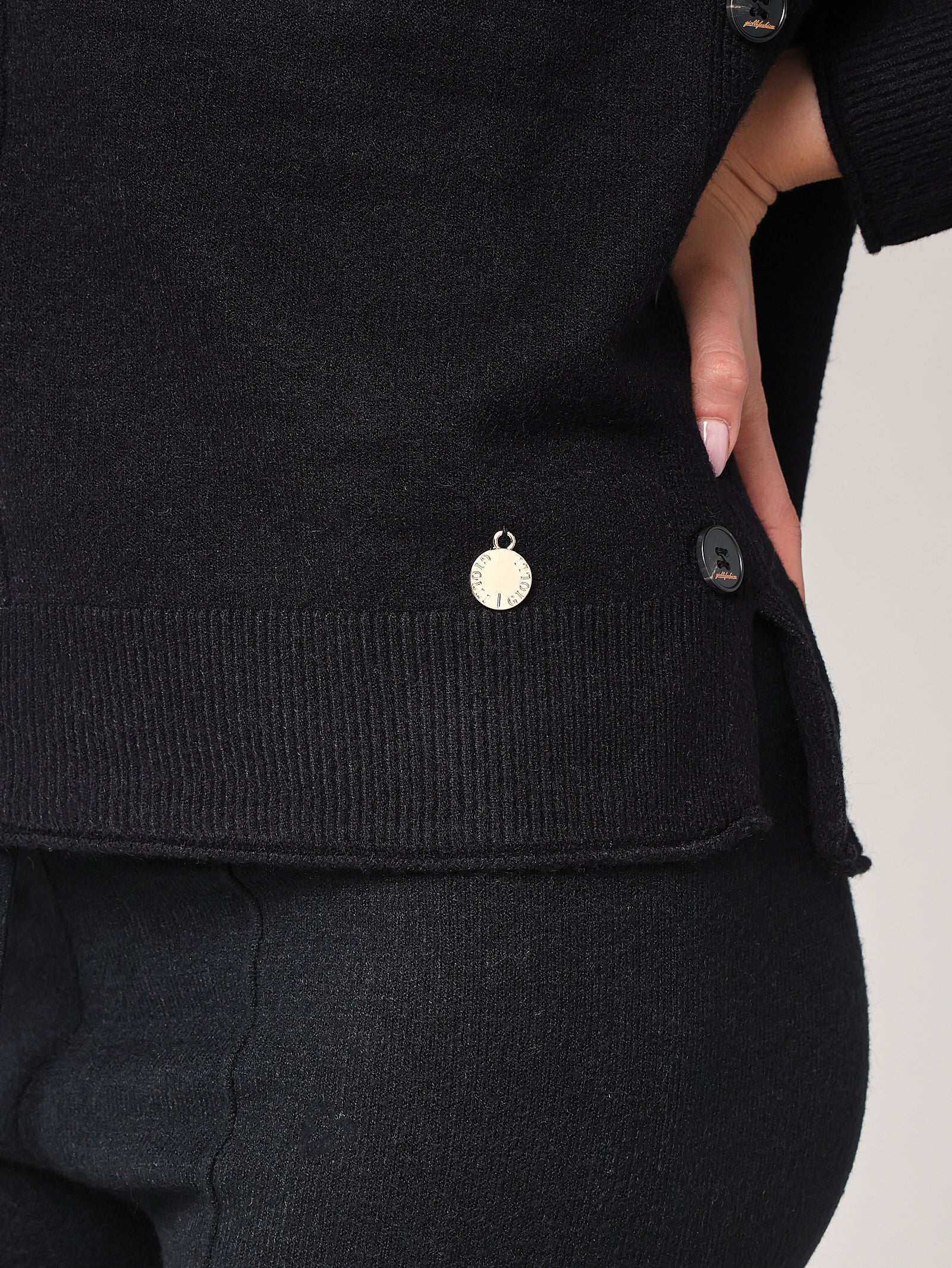 Dettaglio sartoriale: bottoni tono su tono e taglio dritto