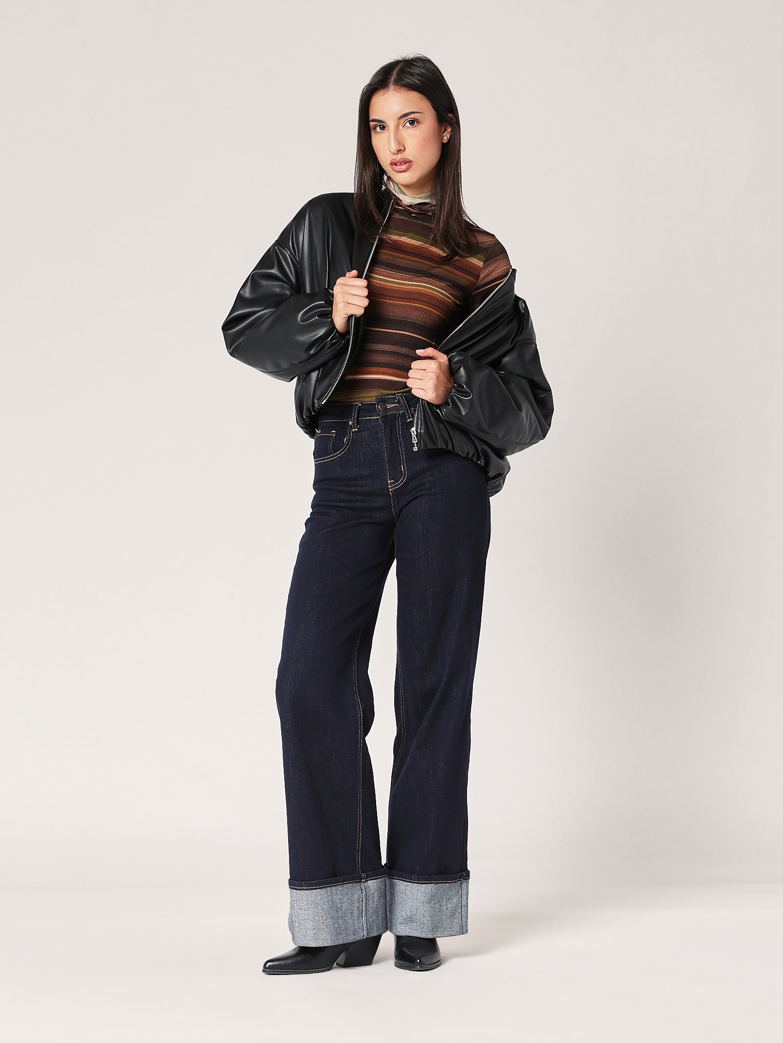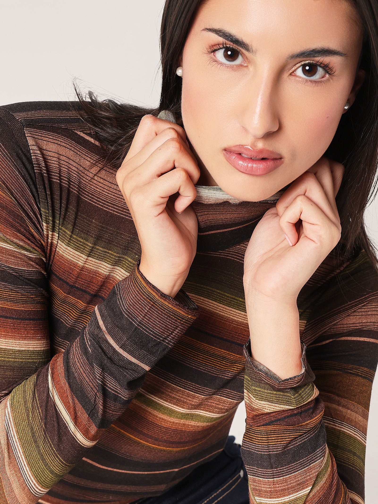 Caldo e avvolgente, il dolcevita a righe cacao è il capo perfetto per chi ama la sobrietà con un twist. Le righe sottili lo rendono raffinato, il colore lo trasforma in un abbraccio elegante.