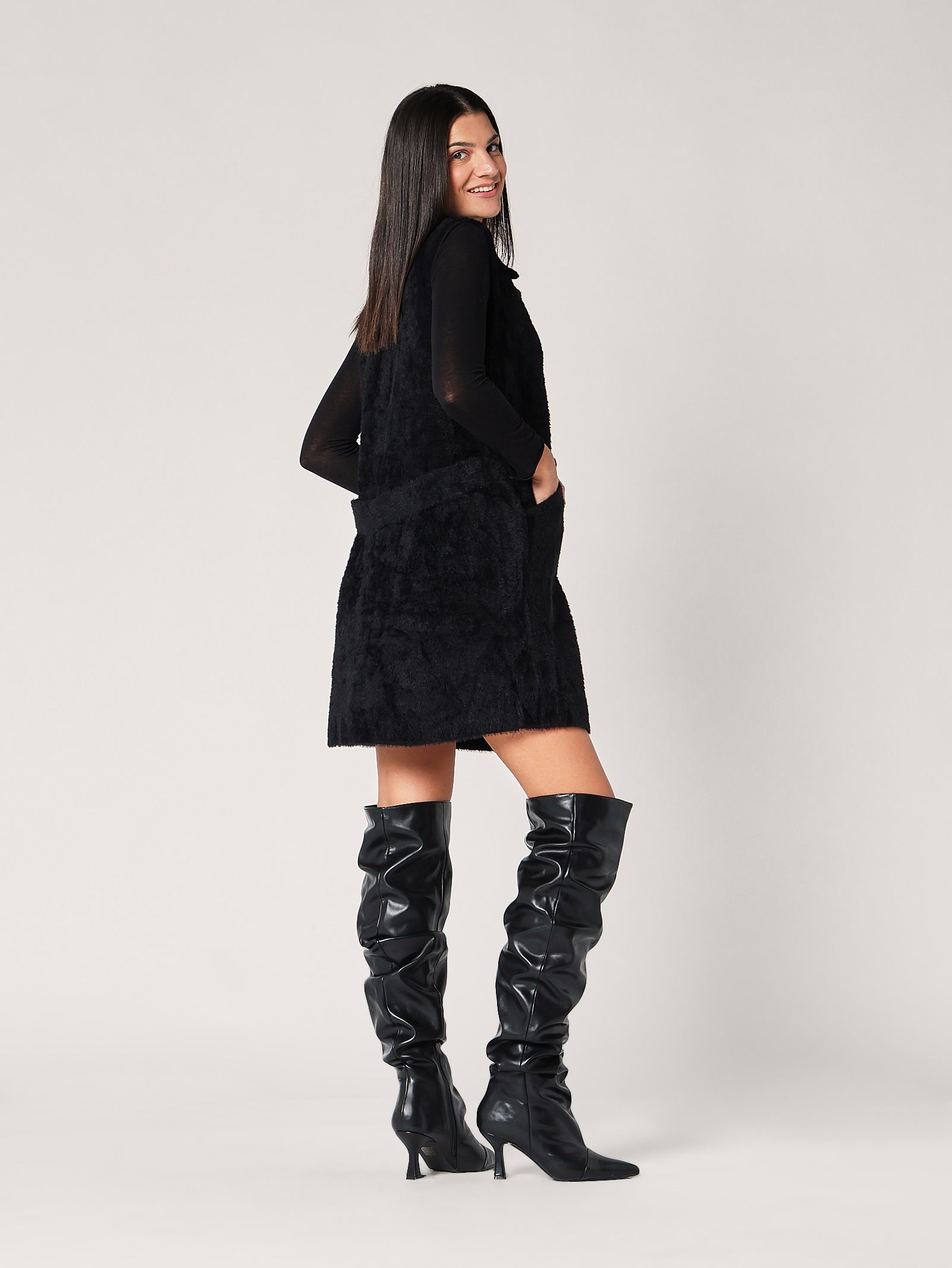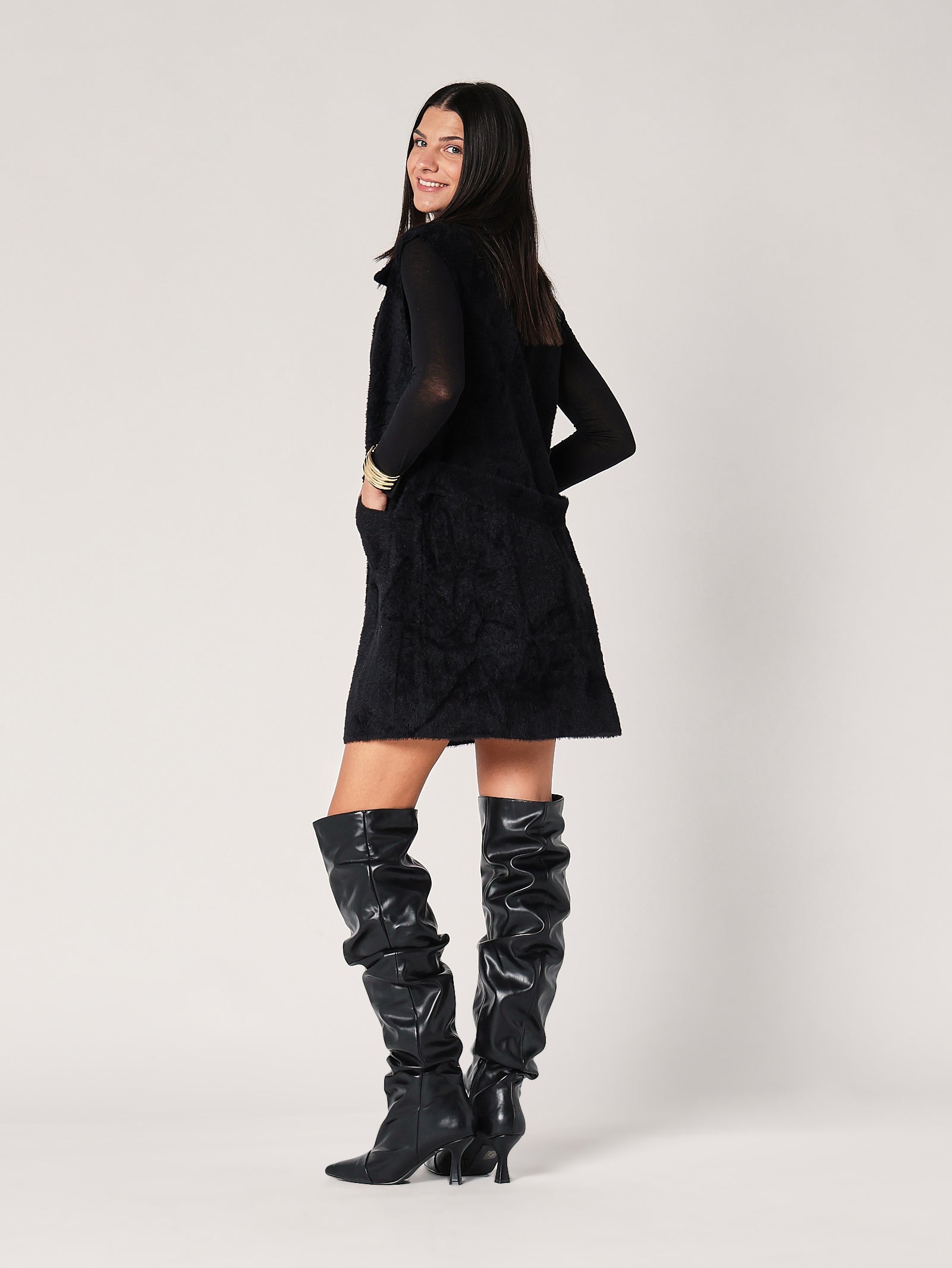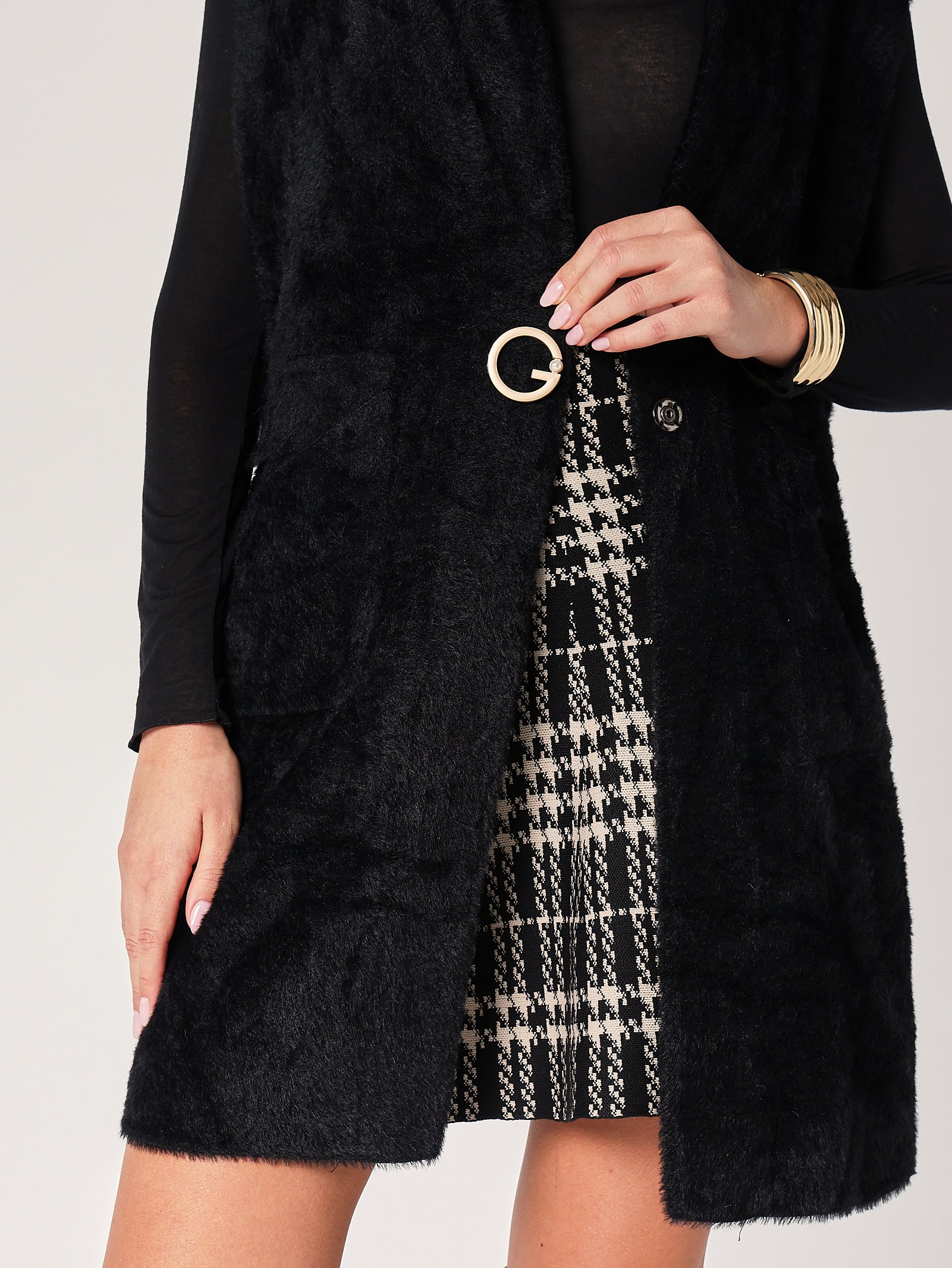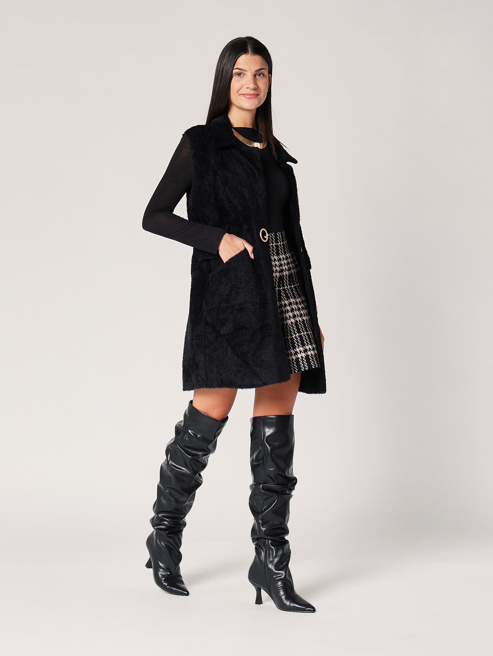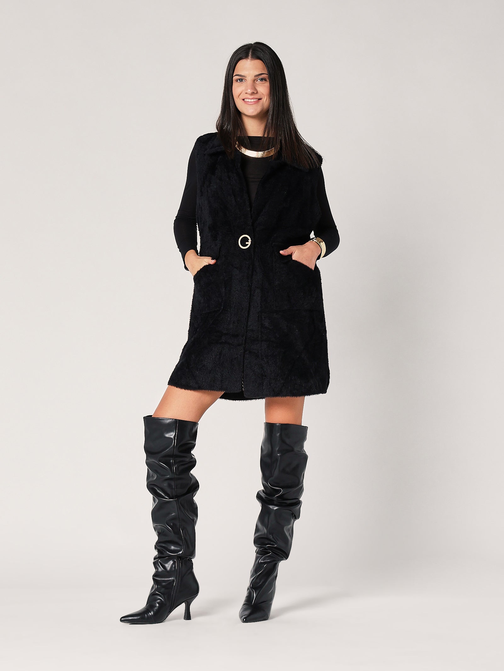 Giacca smanicata elegante con due tasche frontali, ideale per uno stile moderno e sofisticato. Il tessuto strutturato e la linea pulita valorizzano la figura con equilibrio, mentre il design essenziale la rende un capo chiave per i look a strati. Perfetta su camicie, dolcevita o abiti midi.