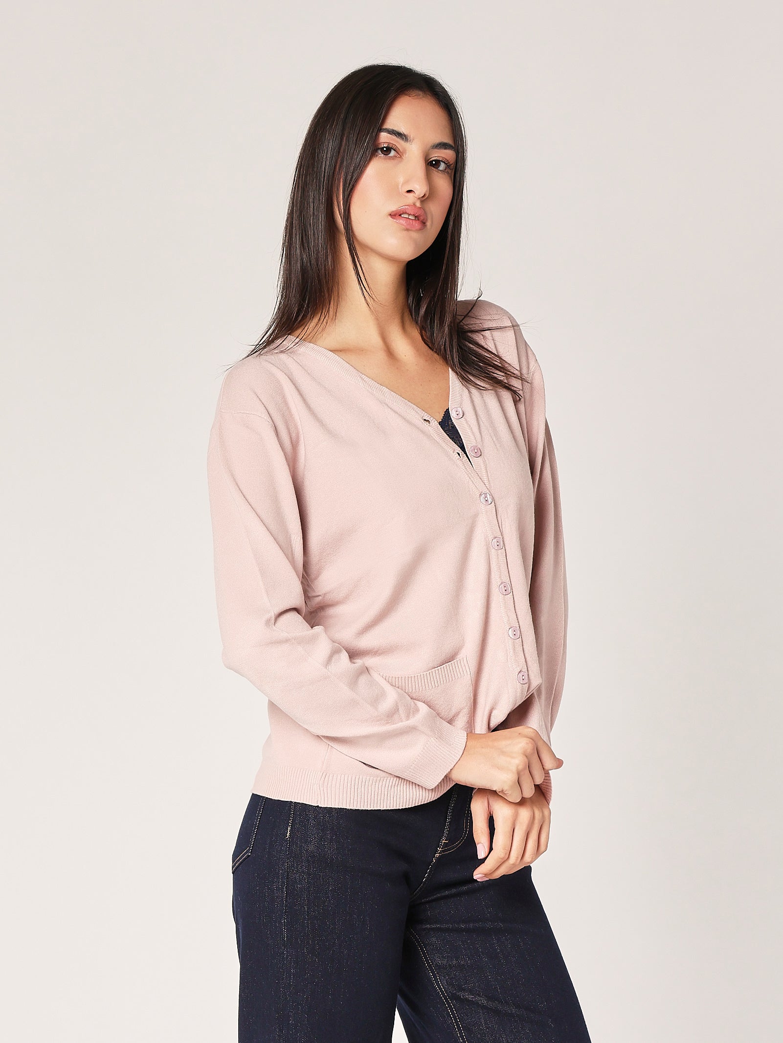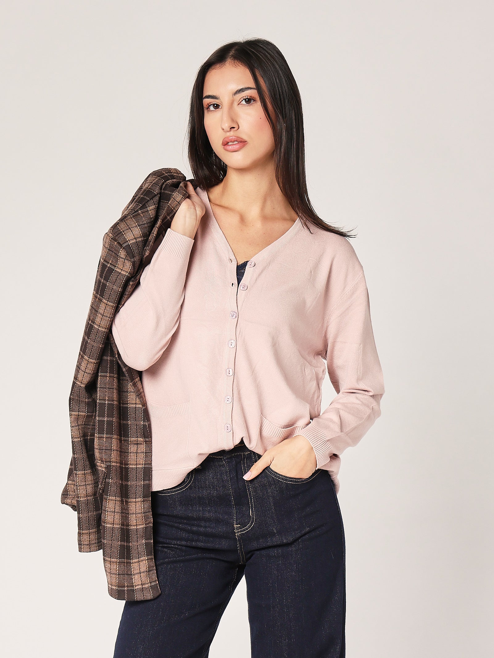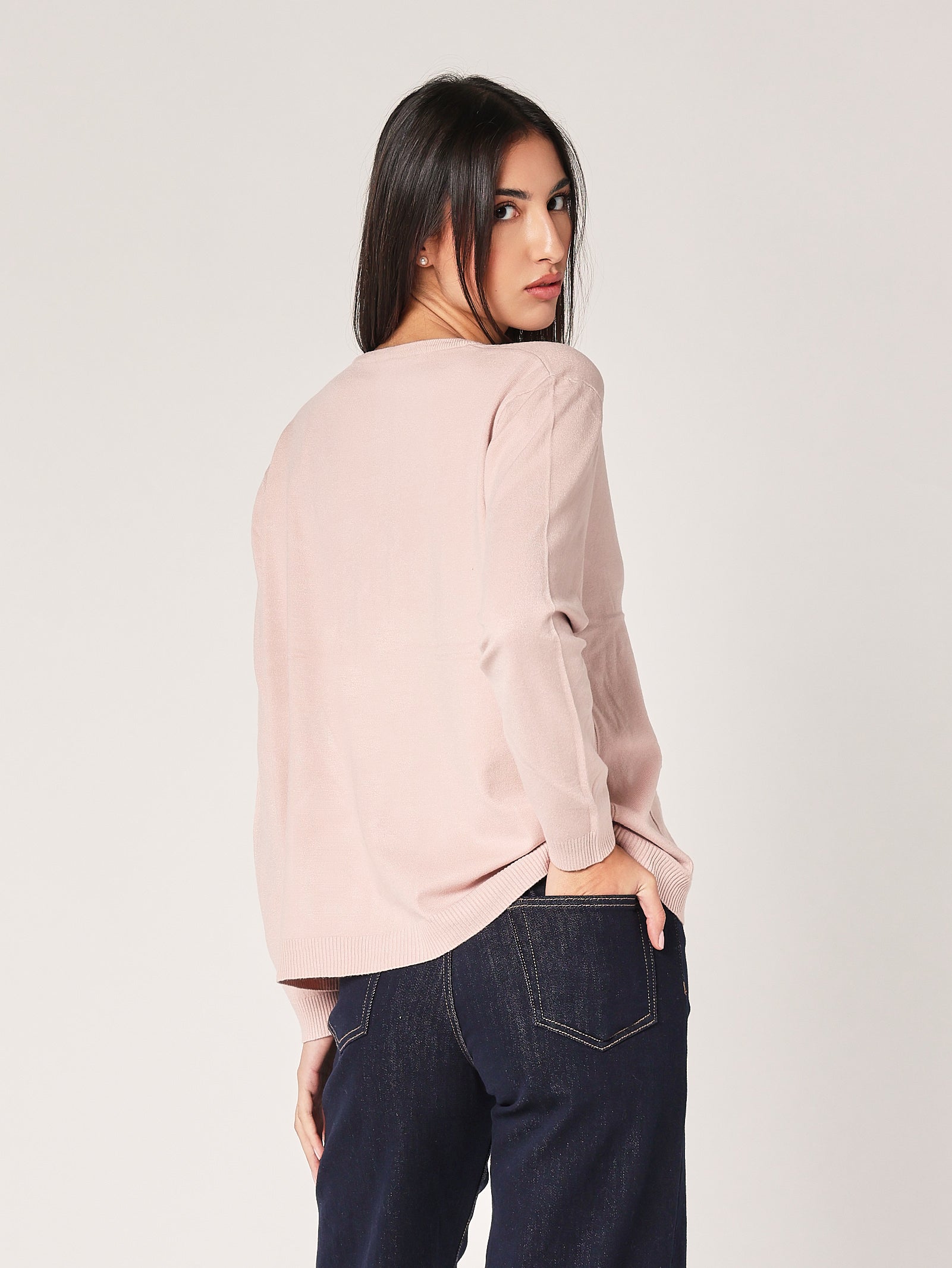 Romantico ma contemporaneo. Il golfino rosa con scollo a V è il tocco di dolcezza che completa anche il look più deciso. Soffice, leggero e super femminile, ha scritto “Monella” su ogni punto.