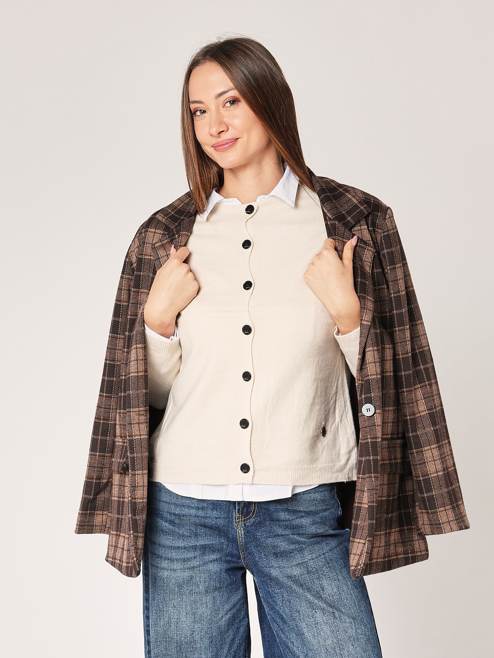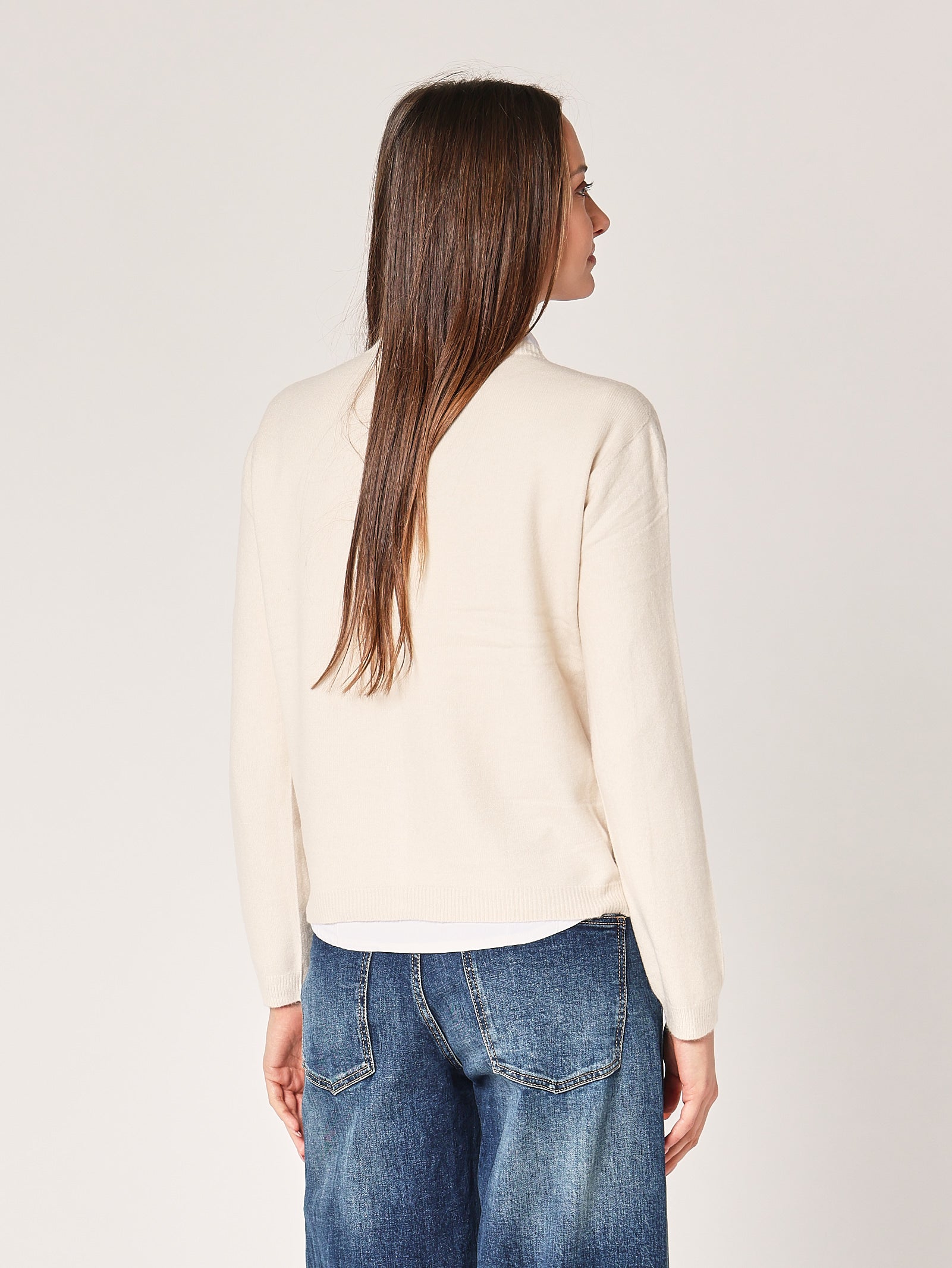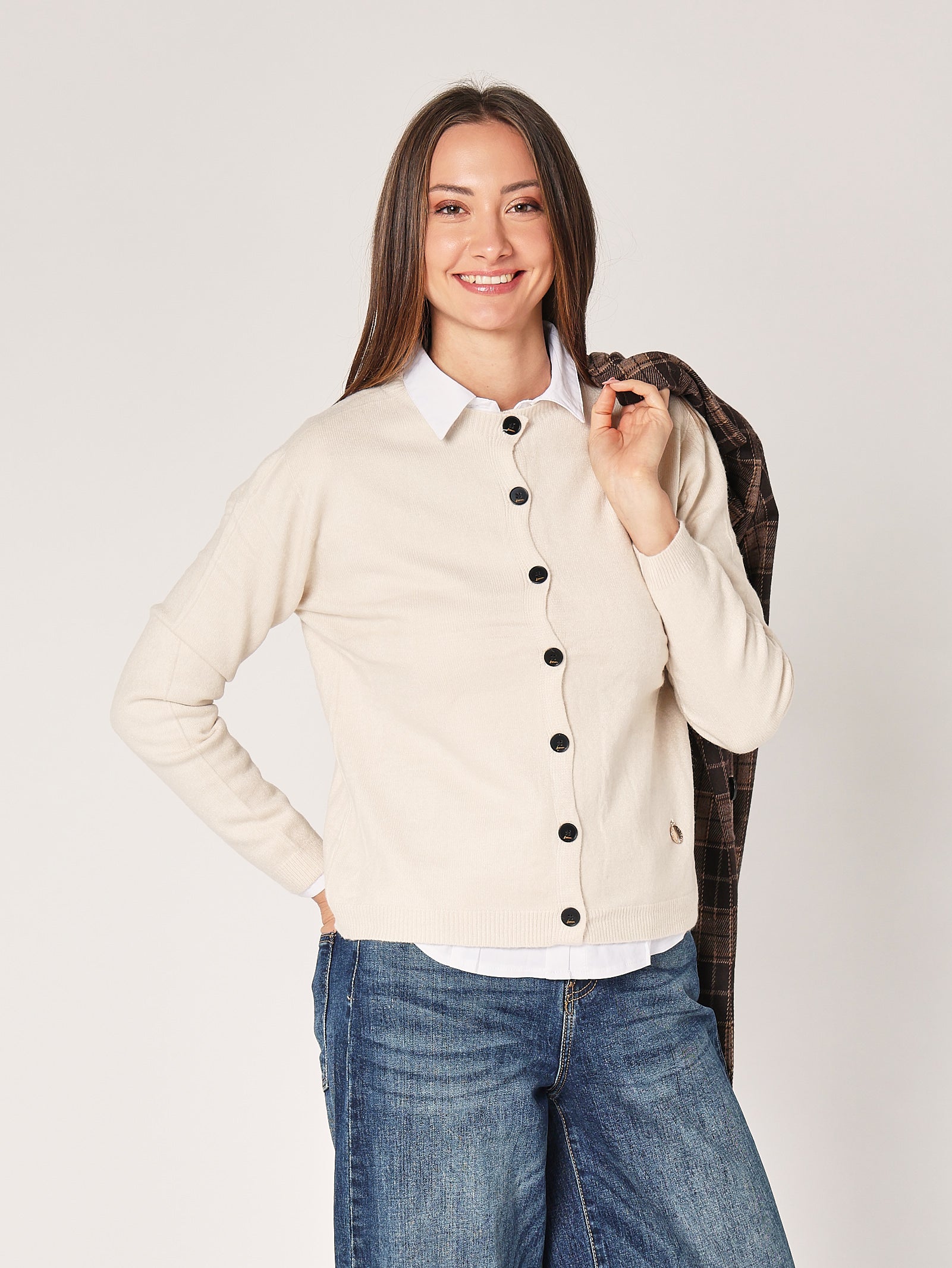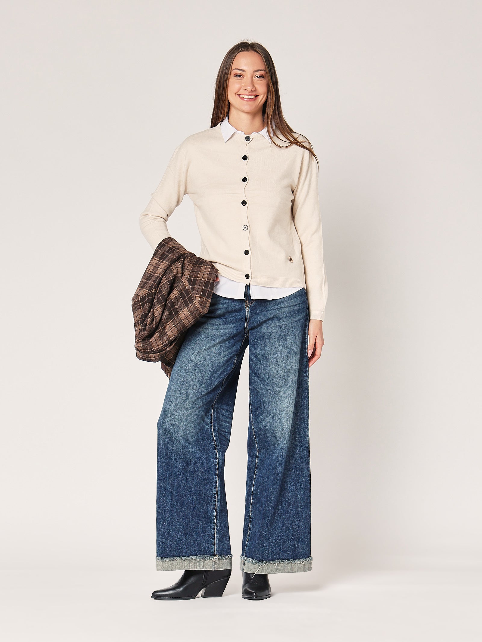 Delicato, luminoso e super femminile. Il golfino color burro è quella coccola chic che completa ogni outfit con naturalezza. Sta bene con tutto e ti fa apparire sempre curata, anche nei momenti più casual.