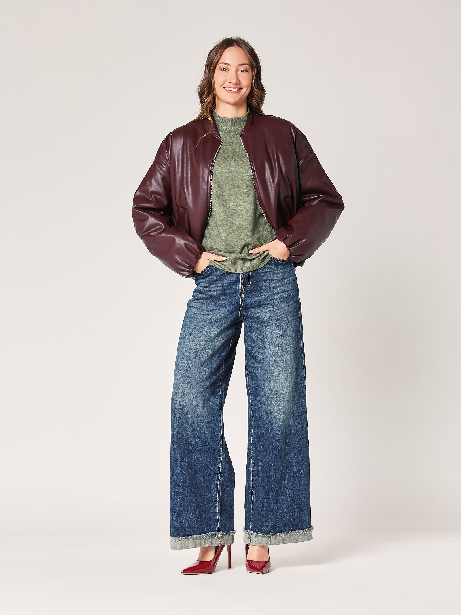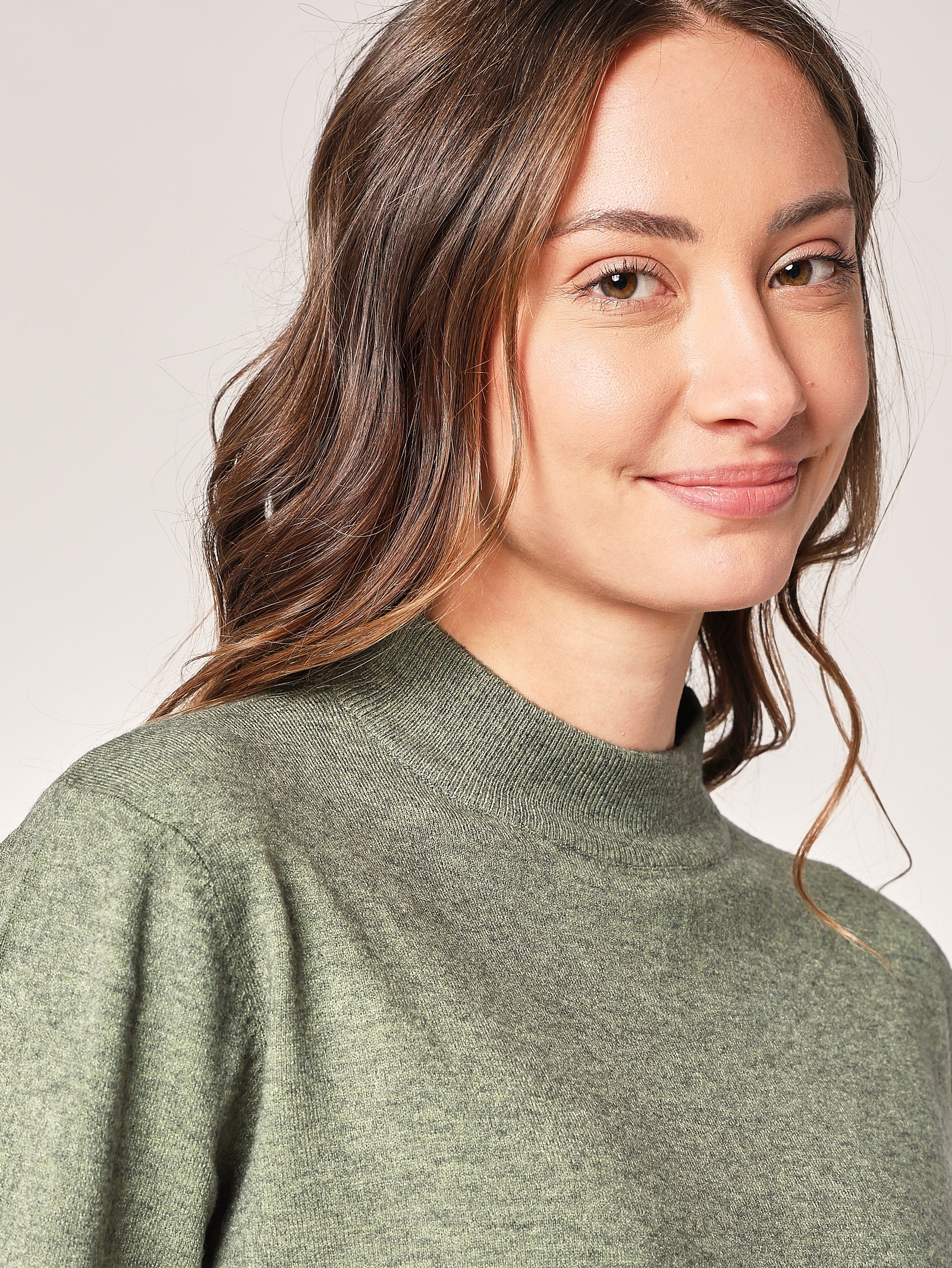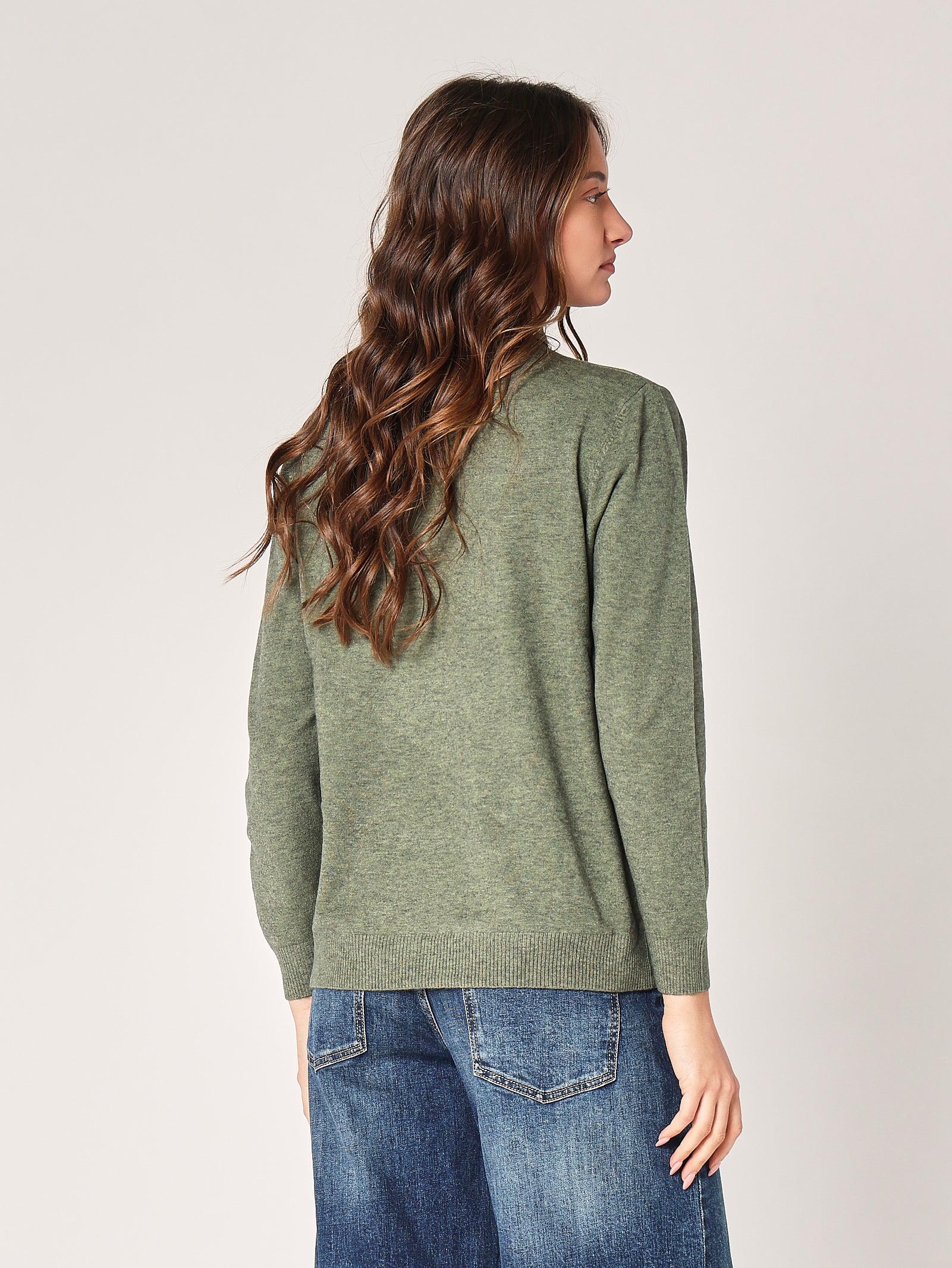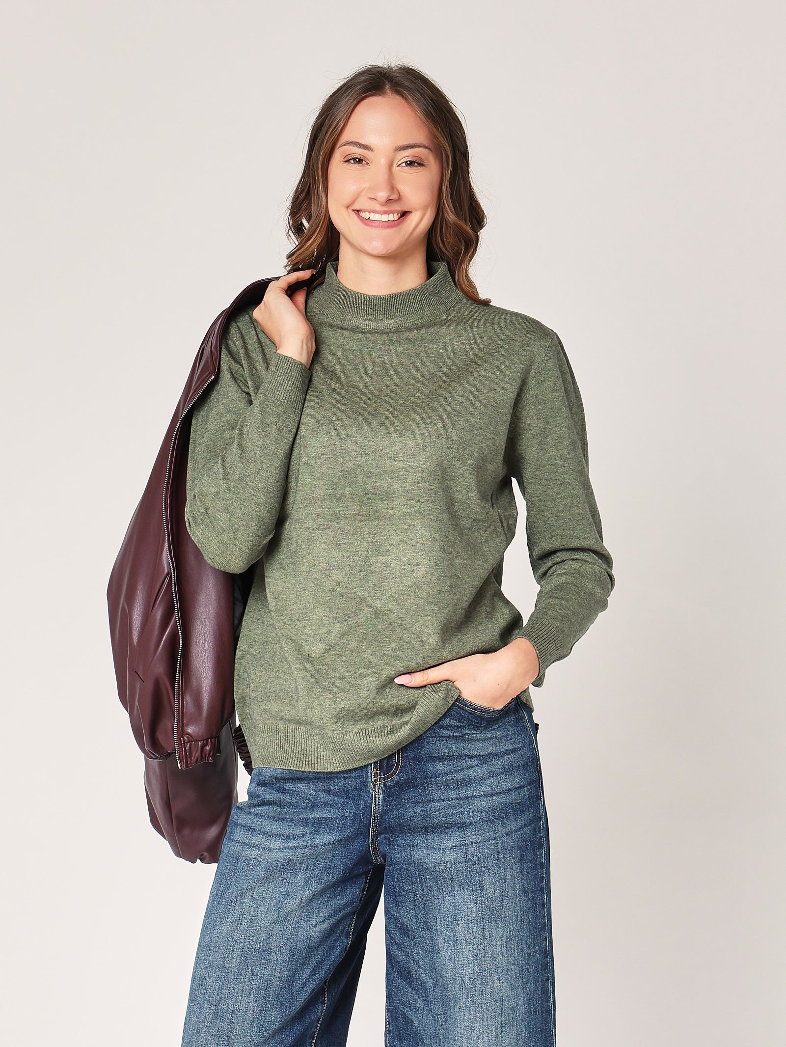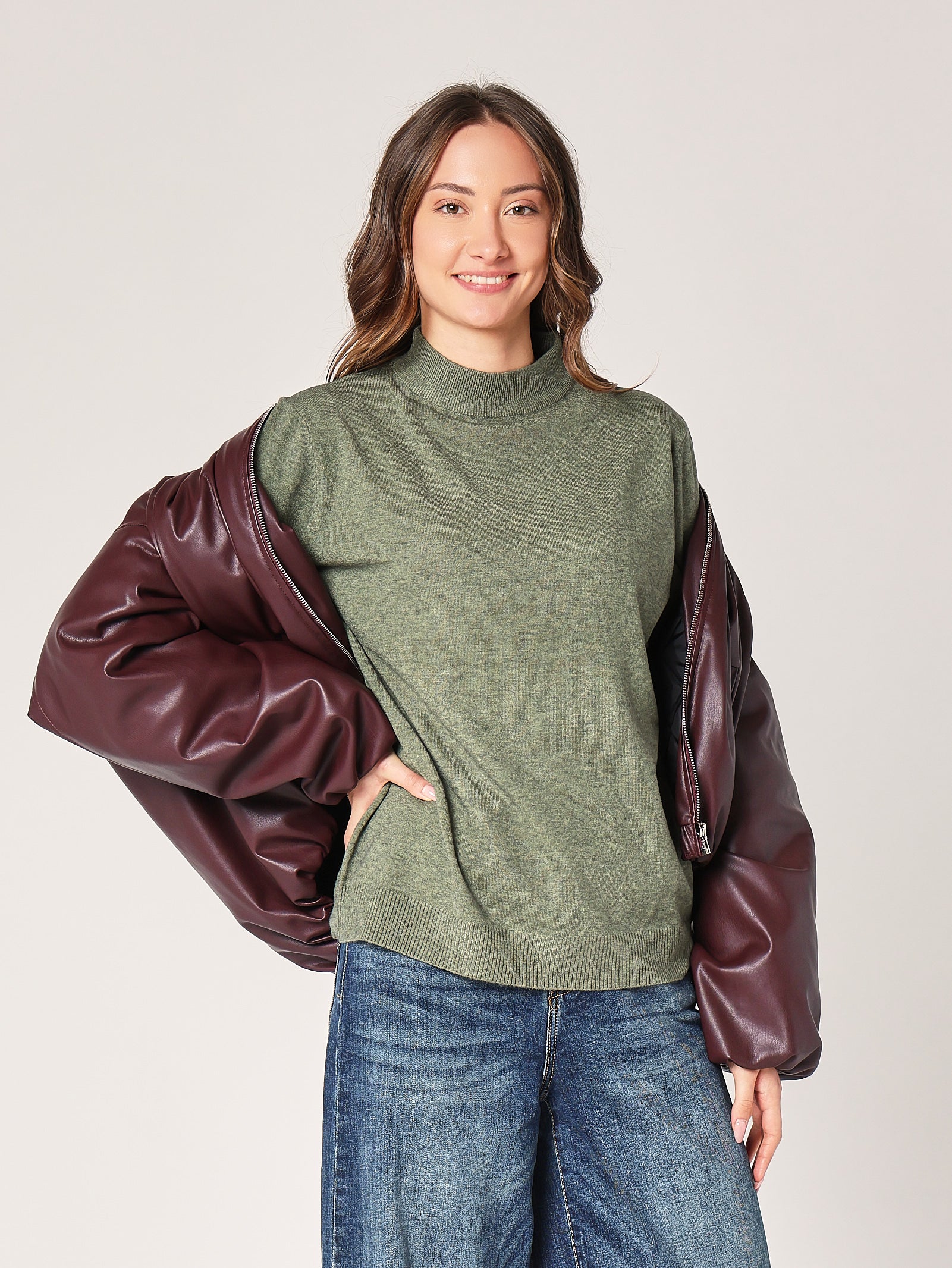 Una ventata di freschezza nel guardaroba. Il lupetto over verde dà vita a ogni outfit, portando una nota vivace ma equilibrata. Perfetto per chi non ha paura di giocare con il colore.