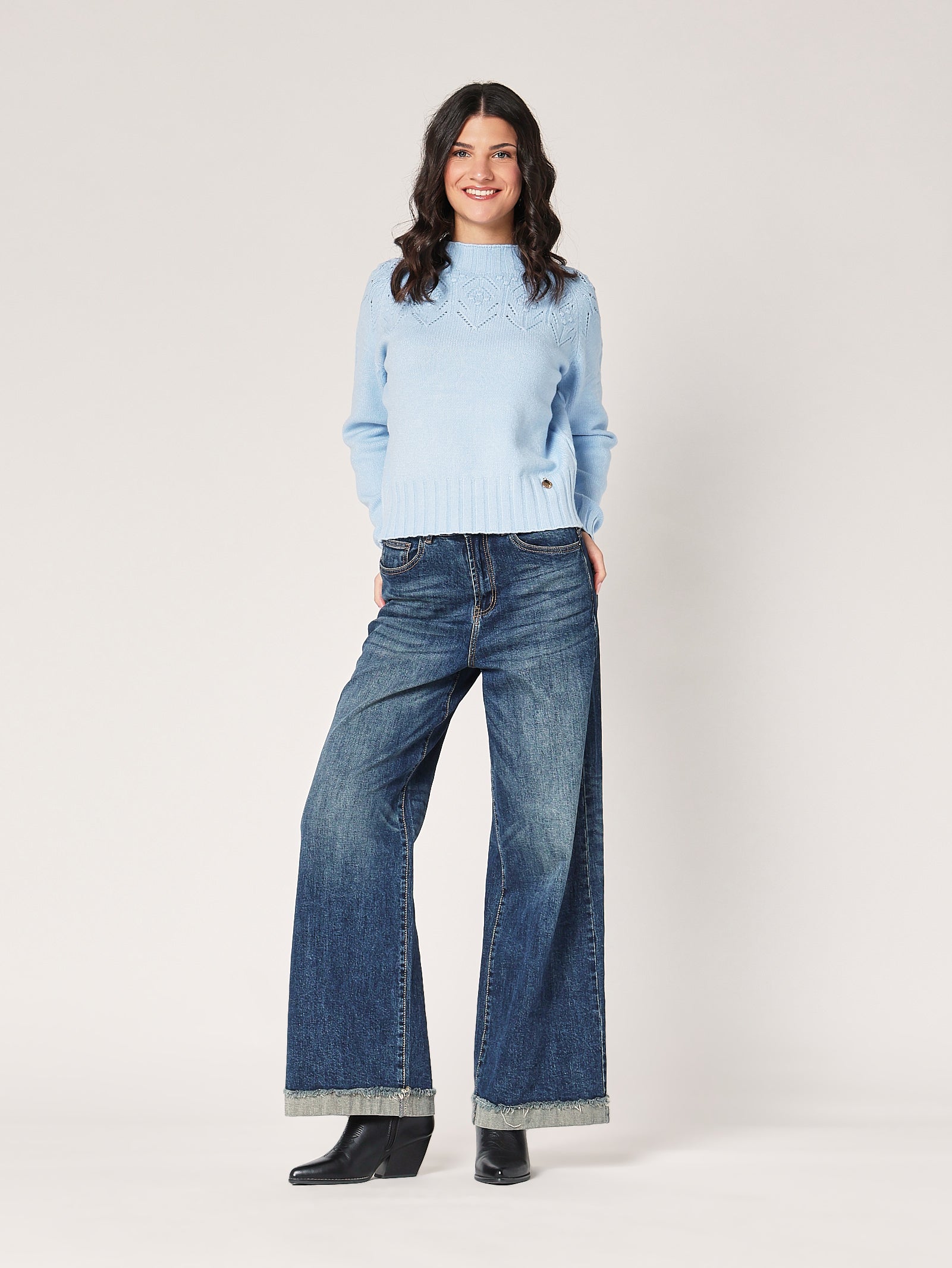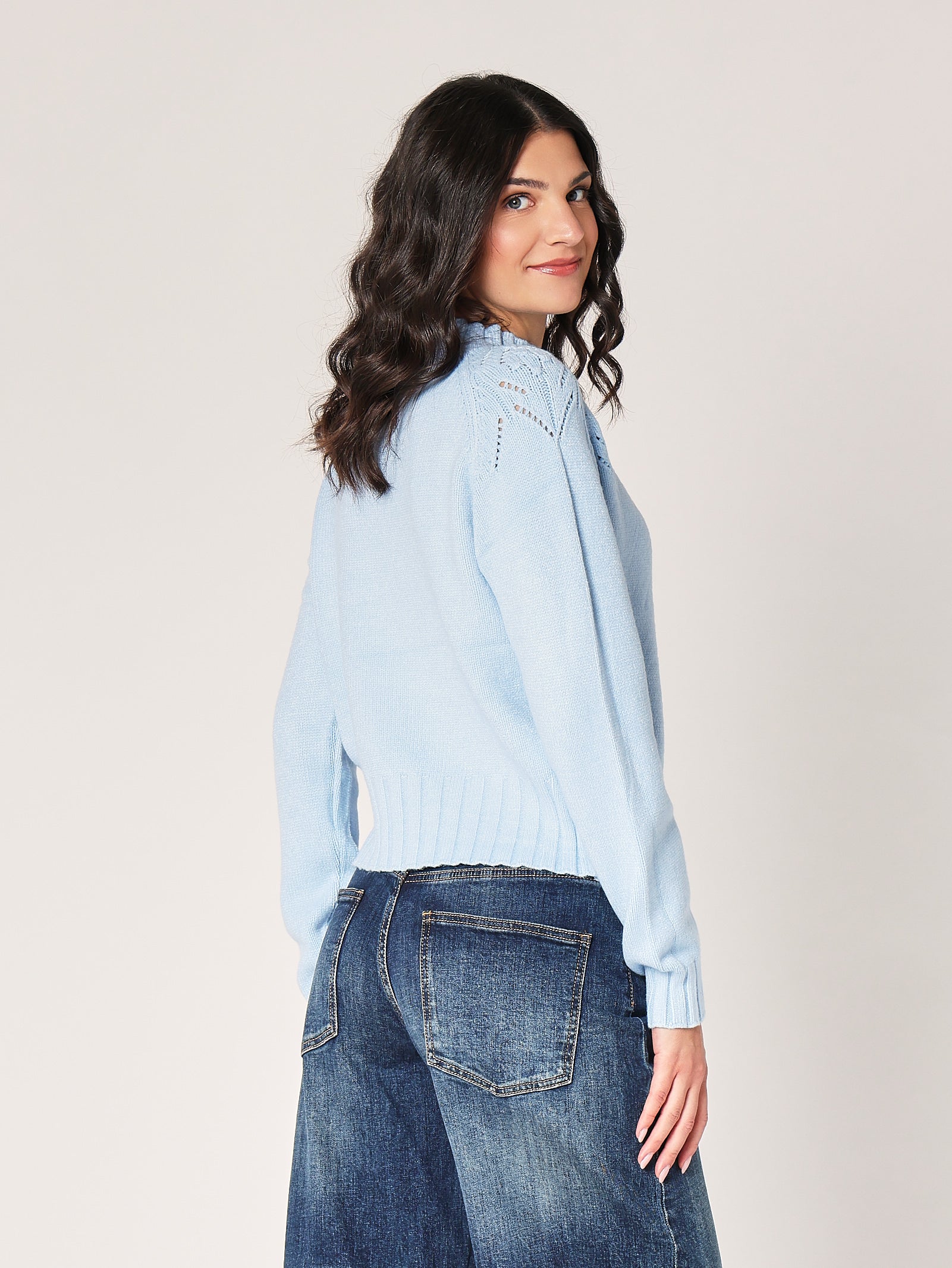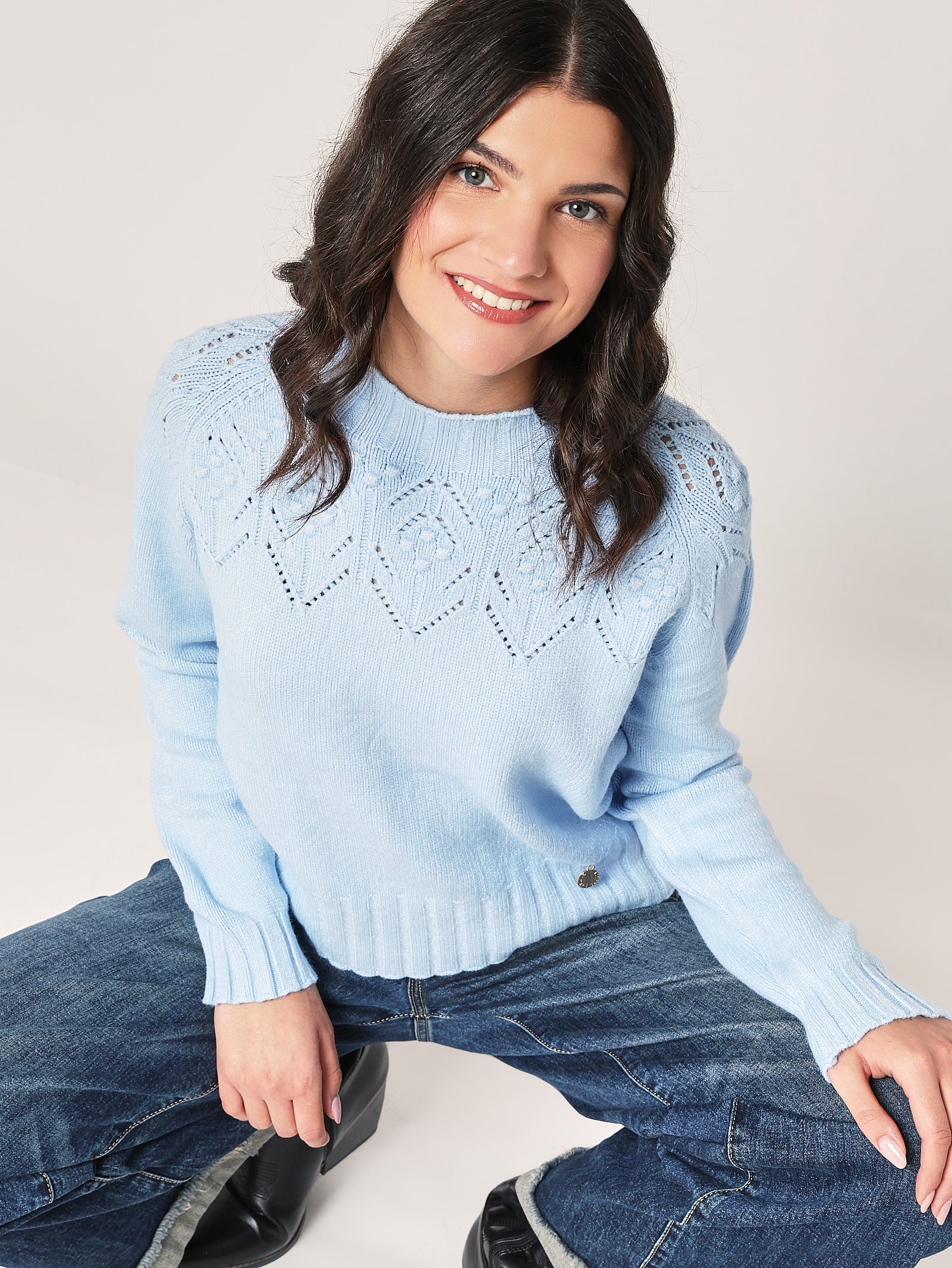 C’è qualcosa di fresco e pulito in questa maglia. L’azzurro le dà quell’aria rilassata ma curata che funziona sempre, dal lunedì in ufficio al sabato tra amiche. Il collo lavorato aggiunge un piccolo twist che cattura senza urlare.