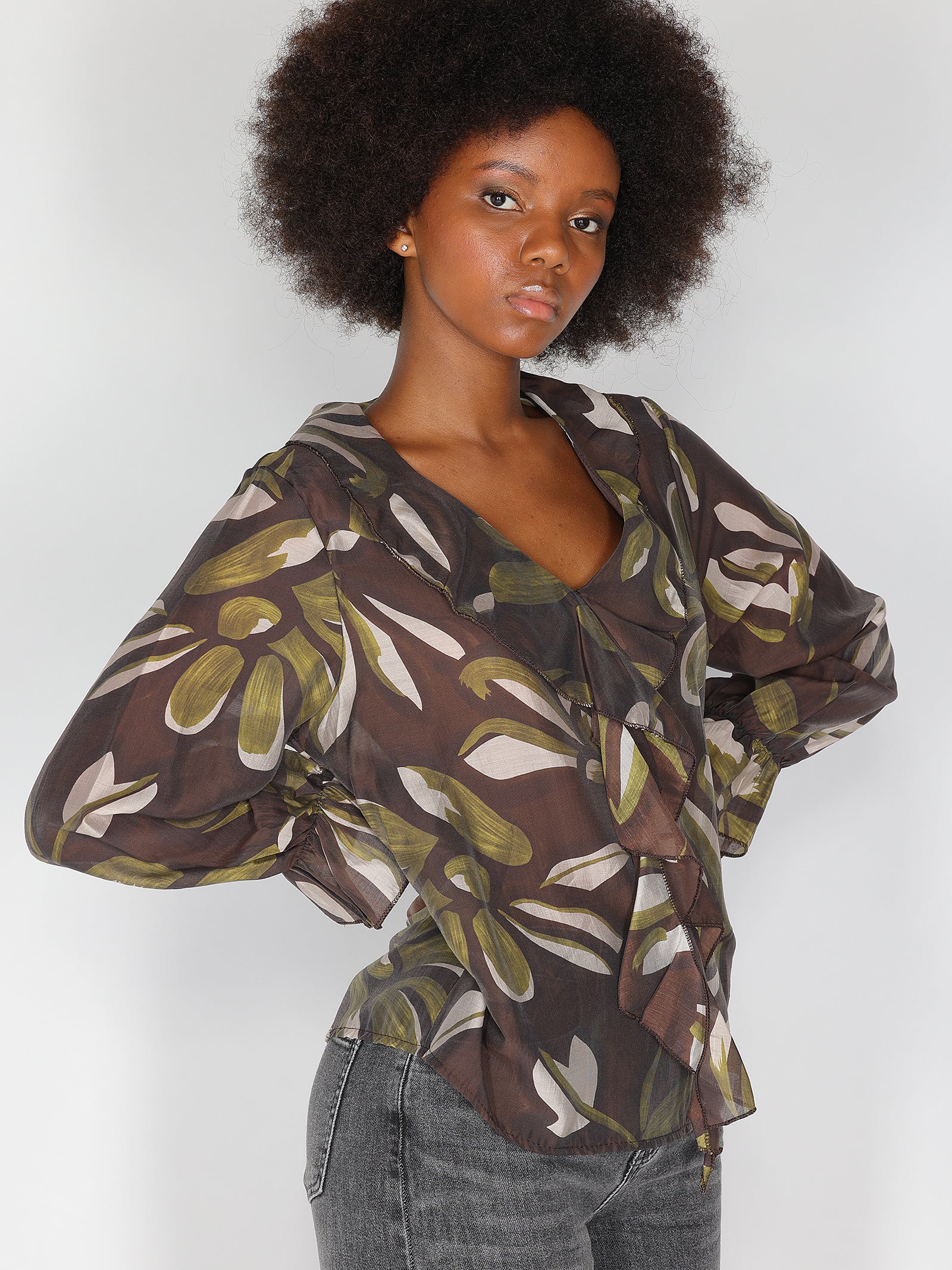 Blusa leggera con fantasia astratta, scollo a V e dettagli di balze sul davanti. Le maniche lunghe con polsino elasticizzato aggiungono un tocco romantico, perfetta per look eleganti e femminili.