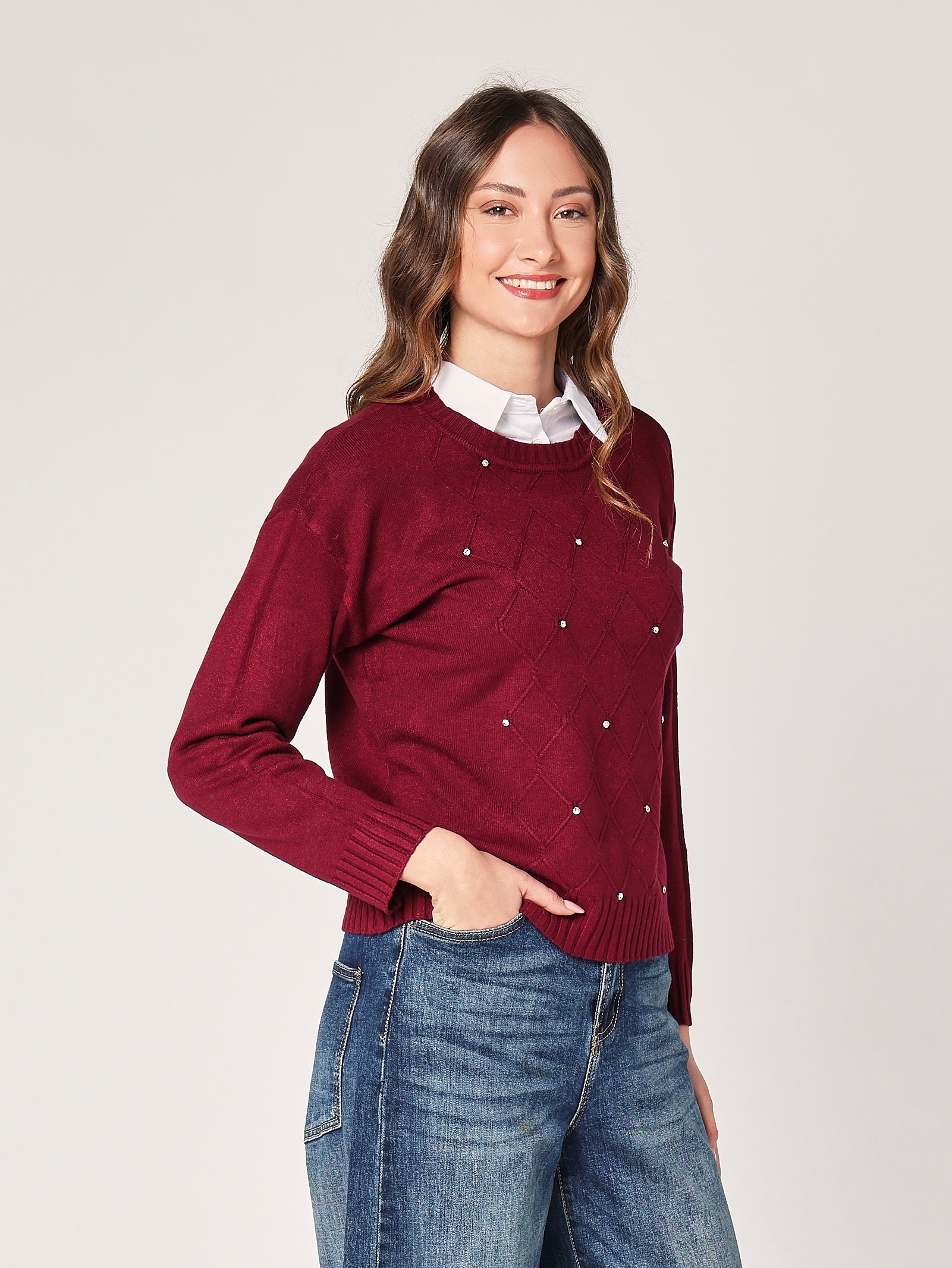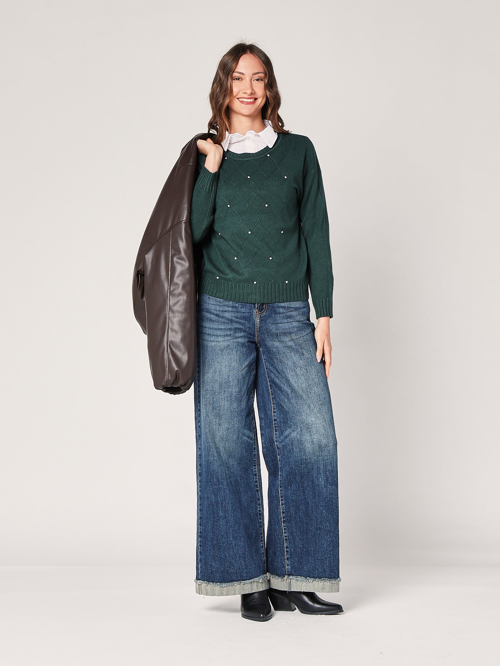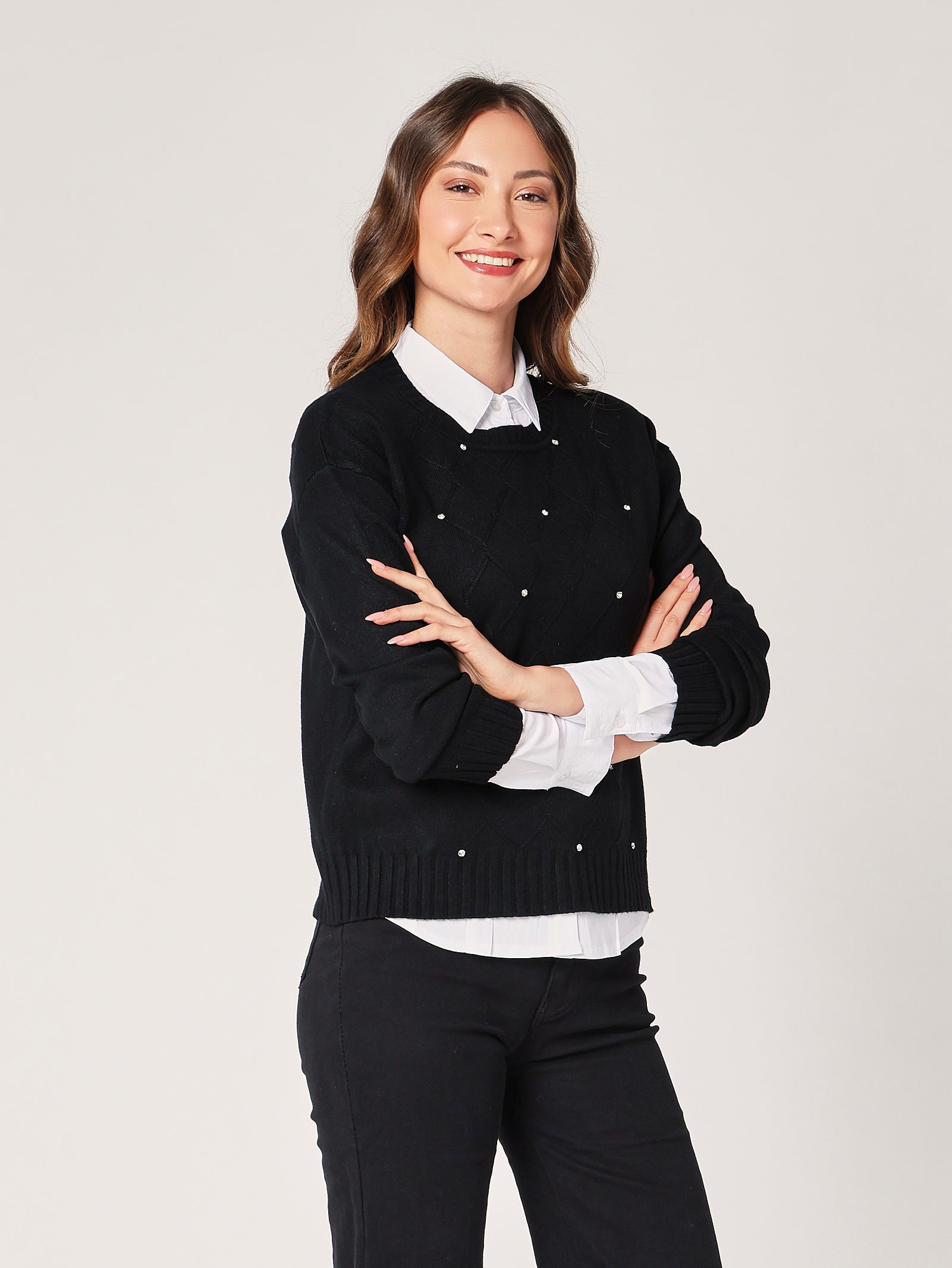 Maglia con rombi e strass, un capo elegante e luminoso che unisce texture e brillantezza con gusto. Il motivo a rombi aggiunge profondità e movimento, mentre gli strass applicati donano luce e femminilità. Morbida e confortevole, è perfetta per look chic e raffinati in ogni occasione.