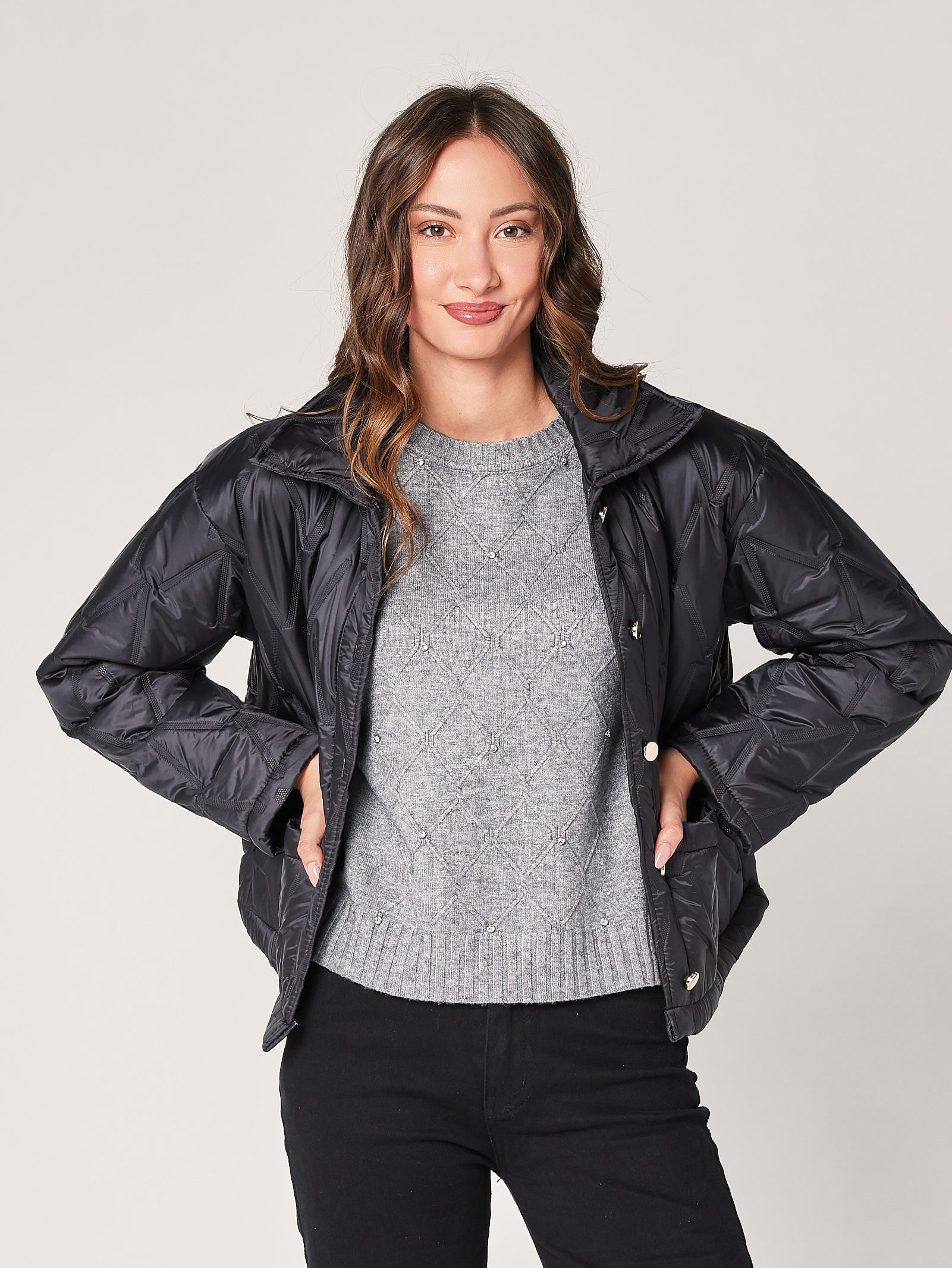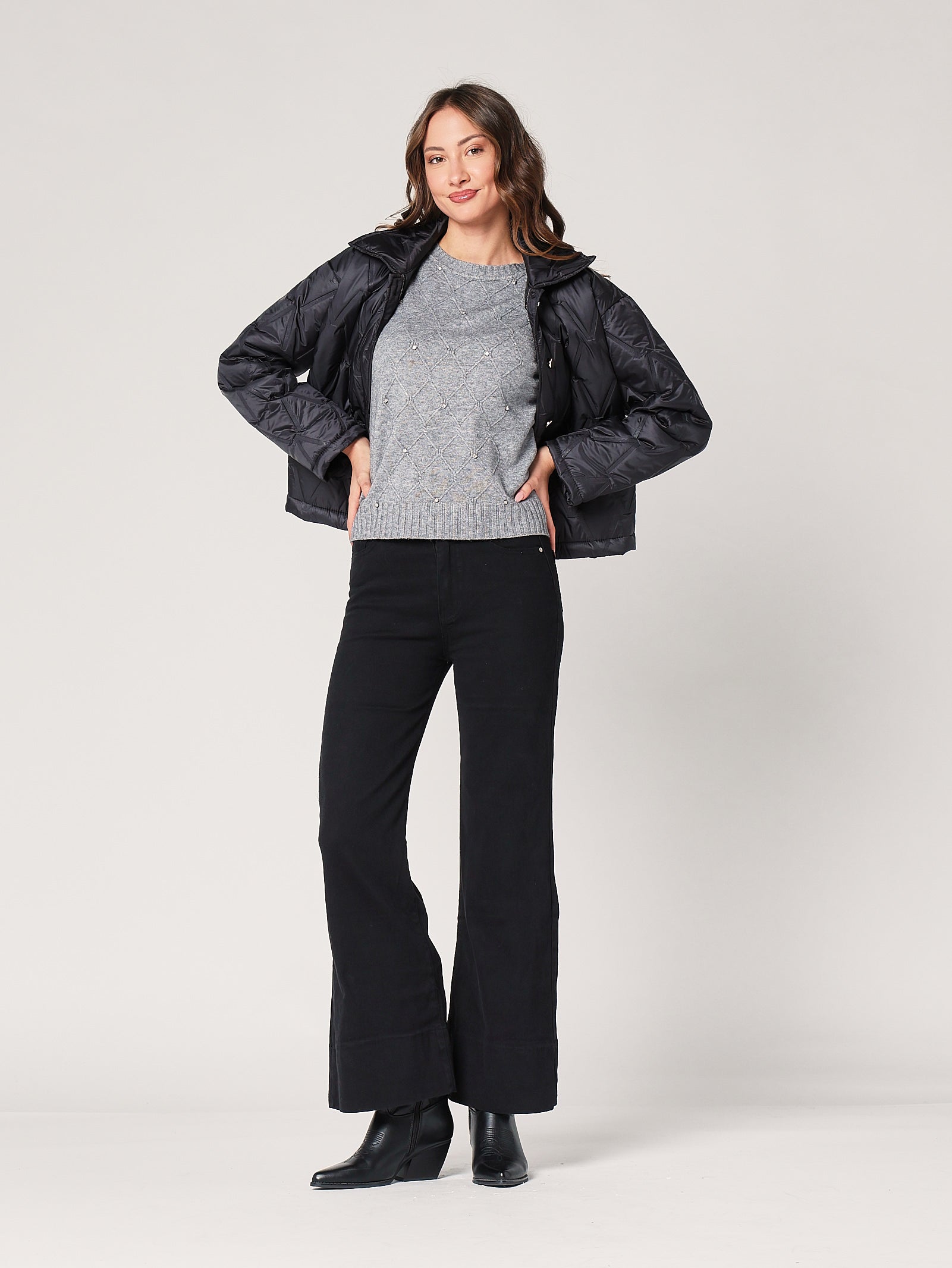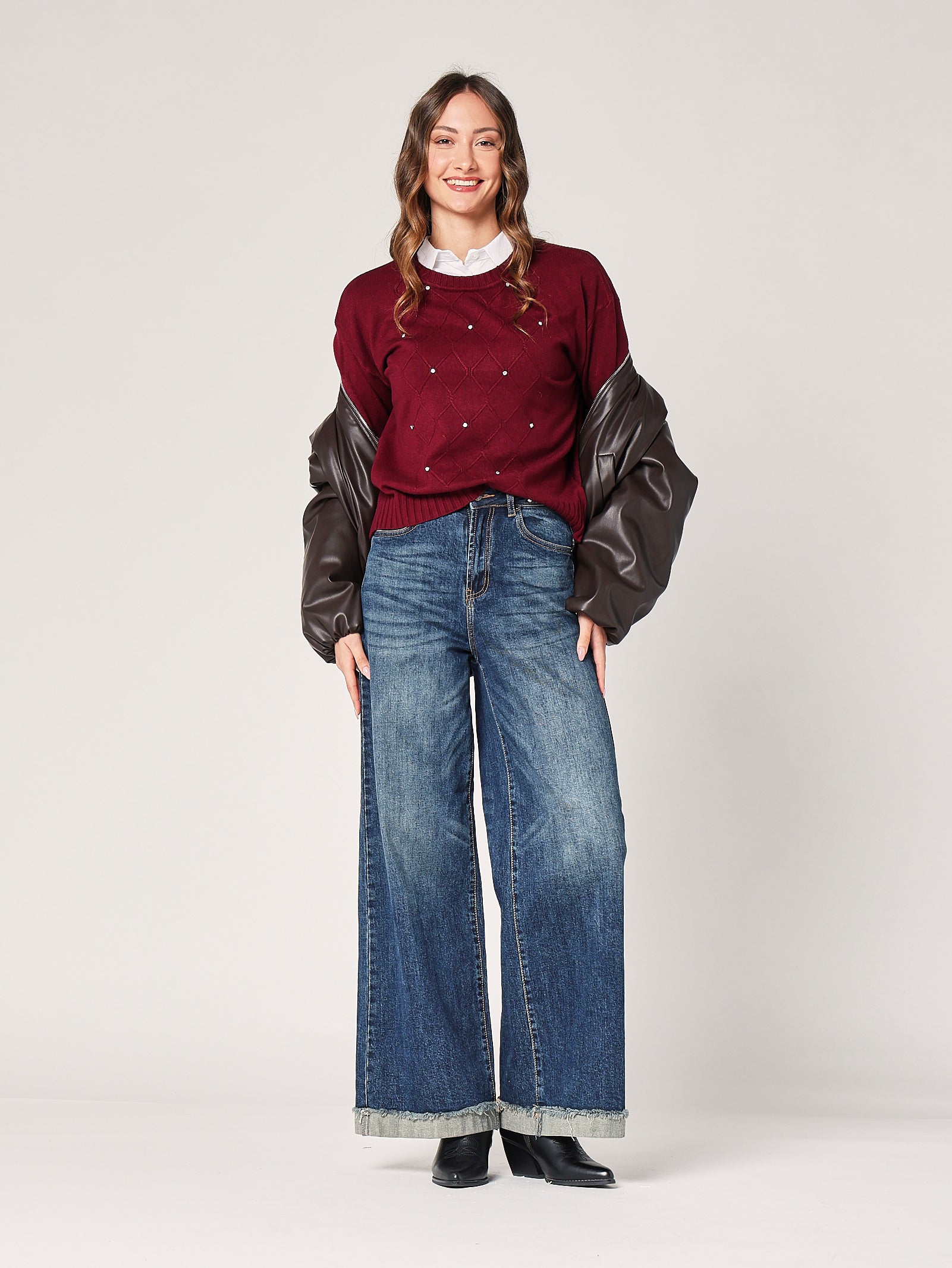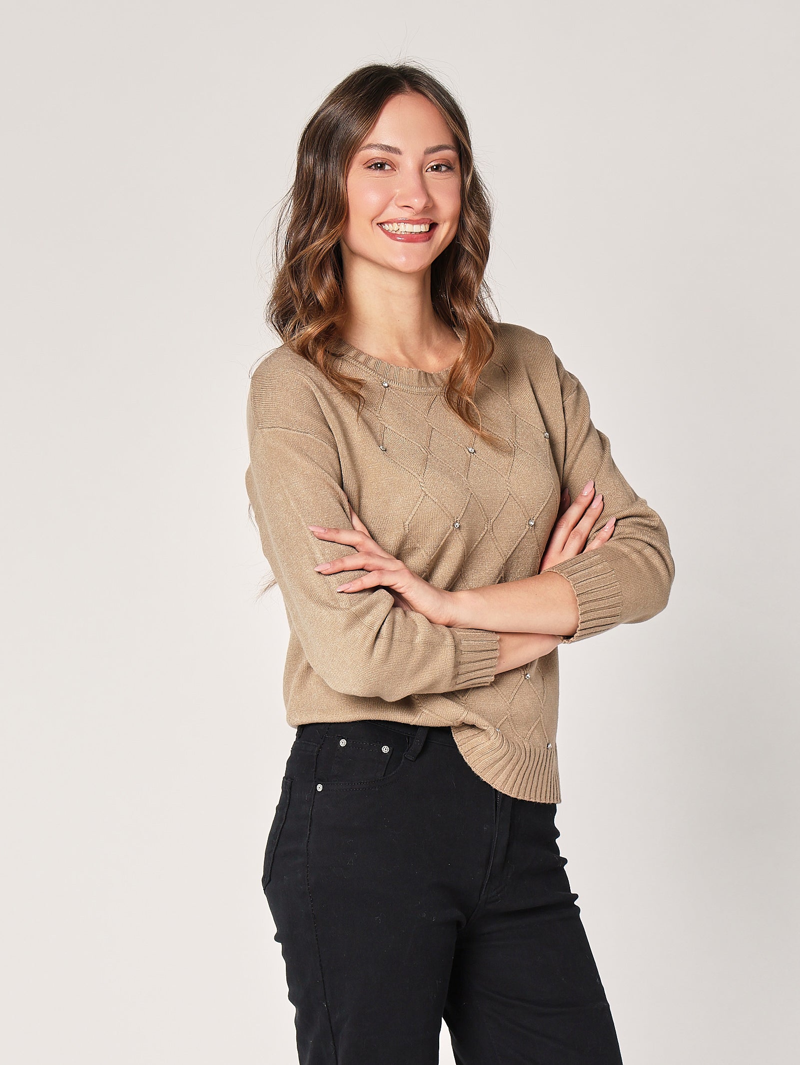 Maglia con rombi e strass, un capo elegante e luminoso che unisce texture e brillantezza con gusto. Il motivo a rombi aggiunge profondità e movimento, mentre gli strass applicati donano luce e femminilità. Morbida e confortevole, è perfetta per look chic e raffinati in ogni occasione.