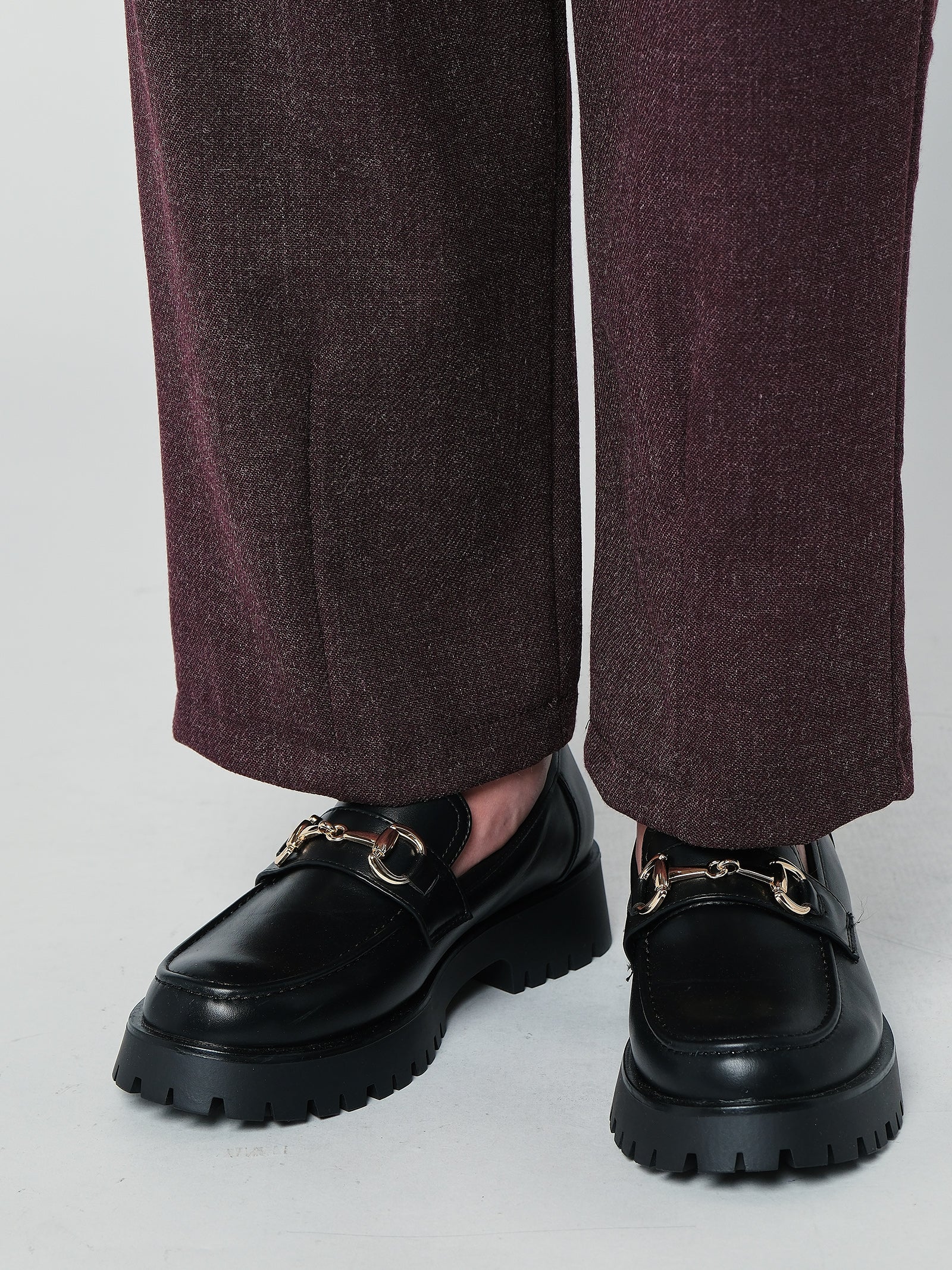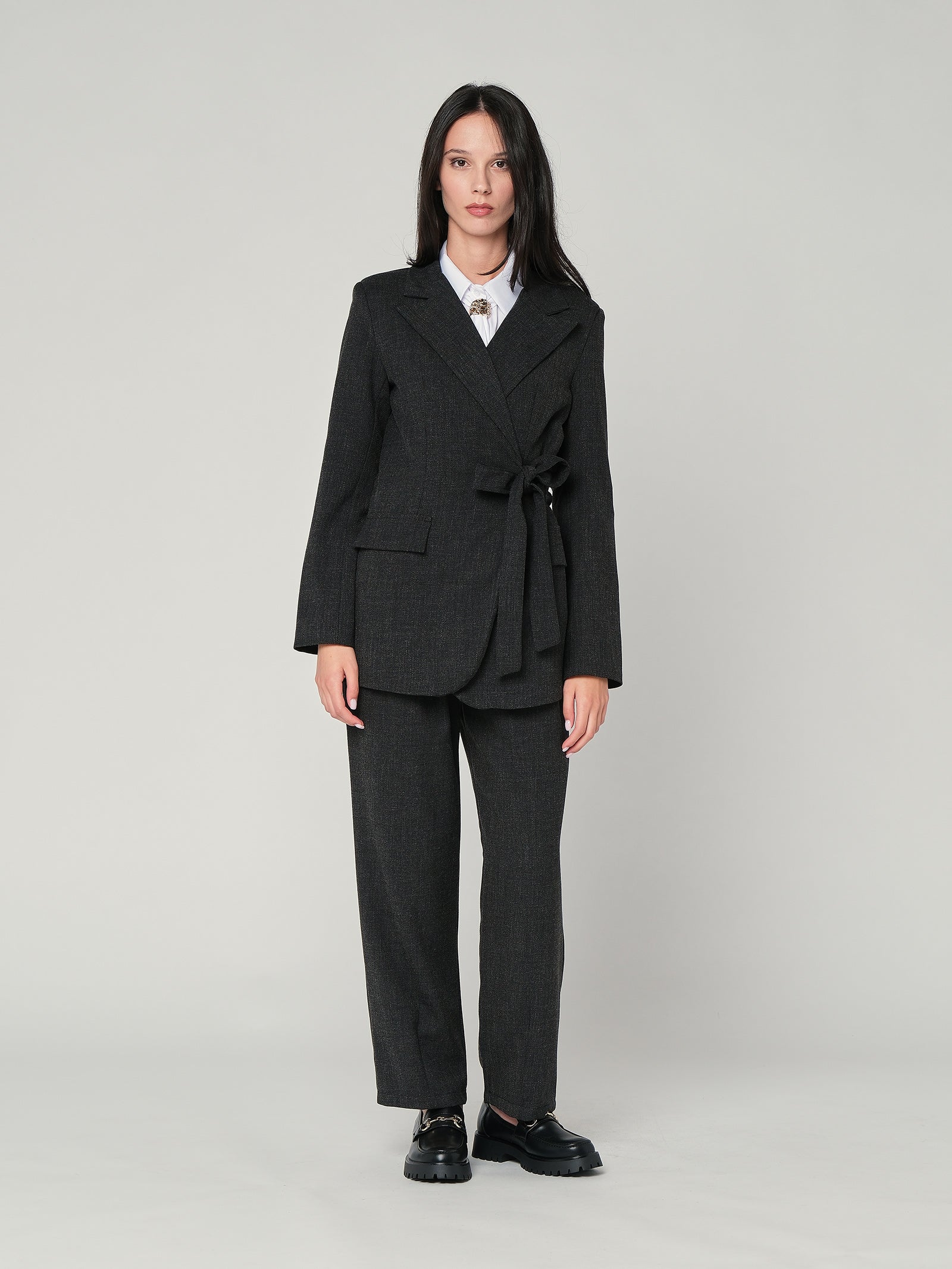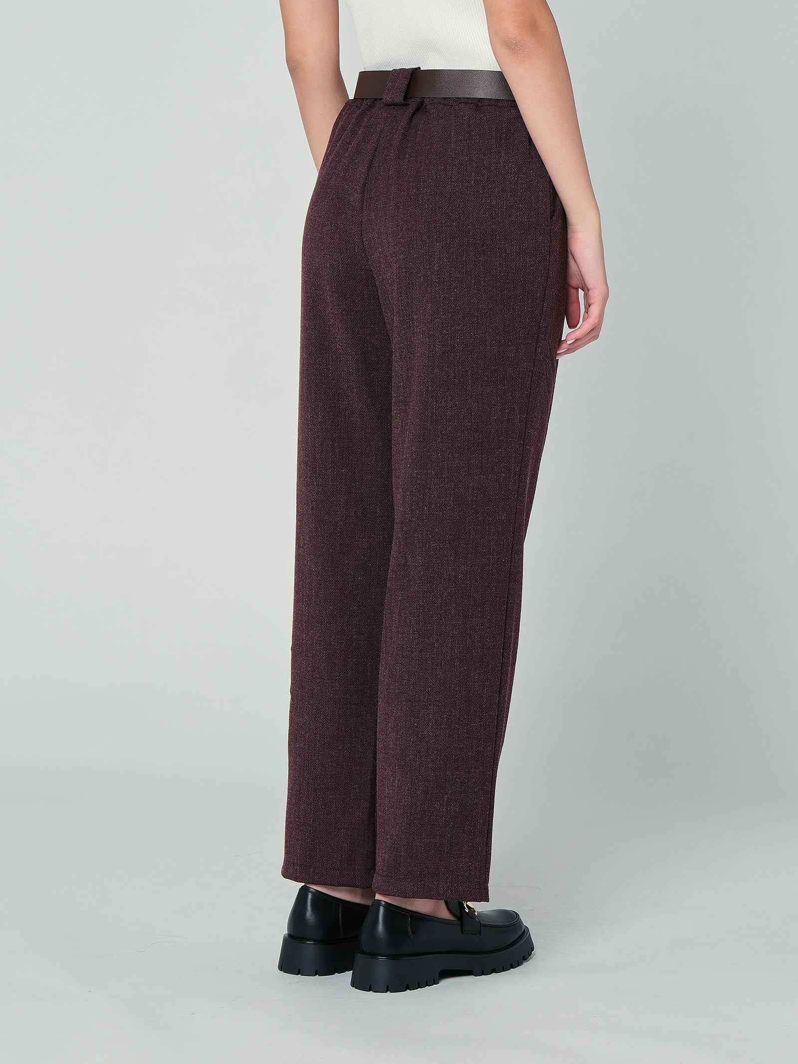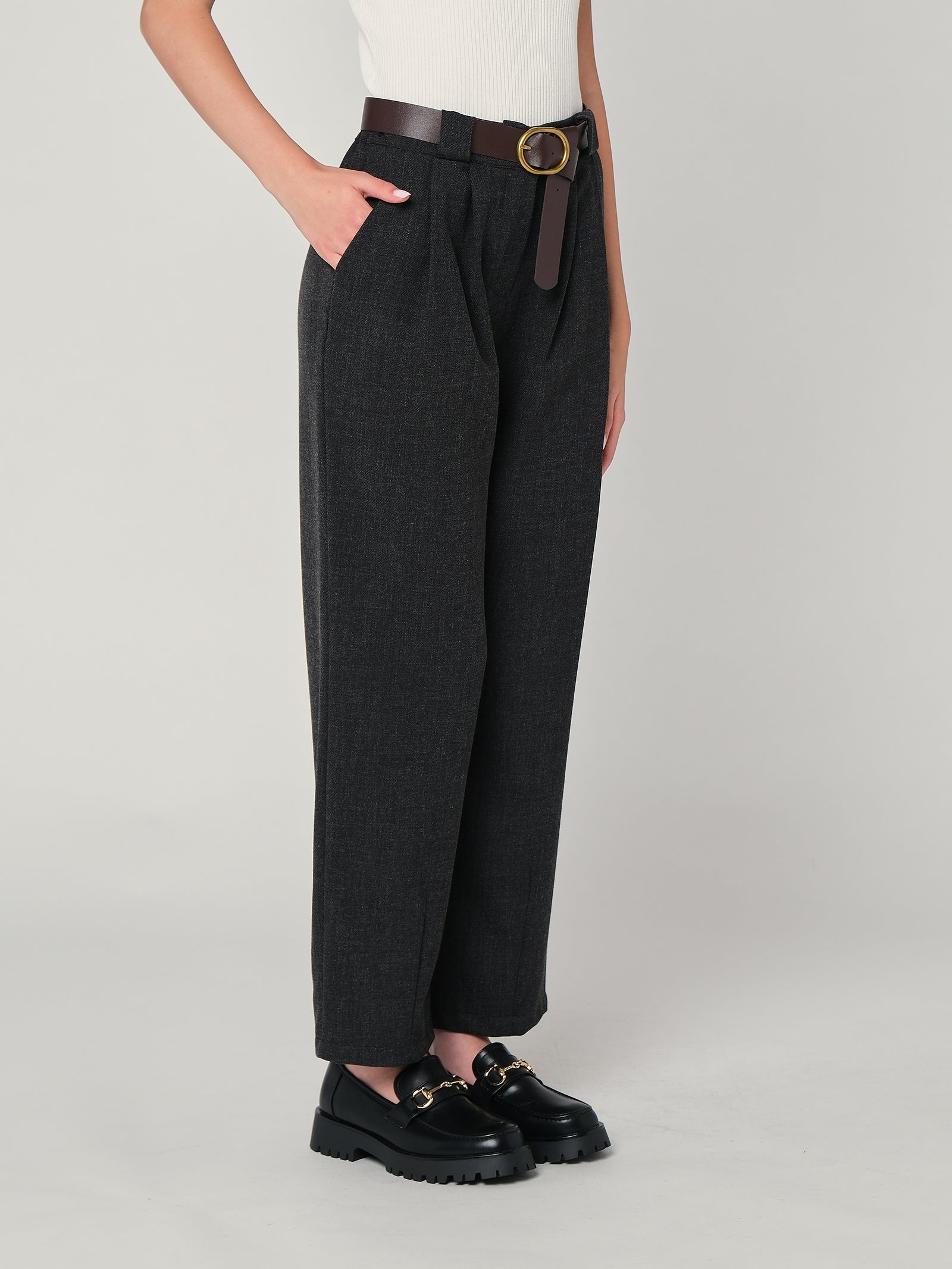 Pantalone dritto con pieghe frontali, tasche laterali e cintura abbinata con fibbia.