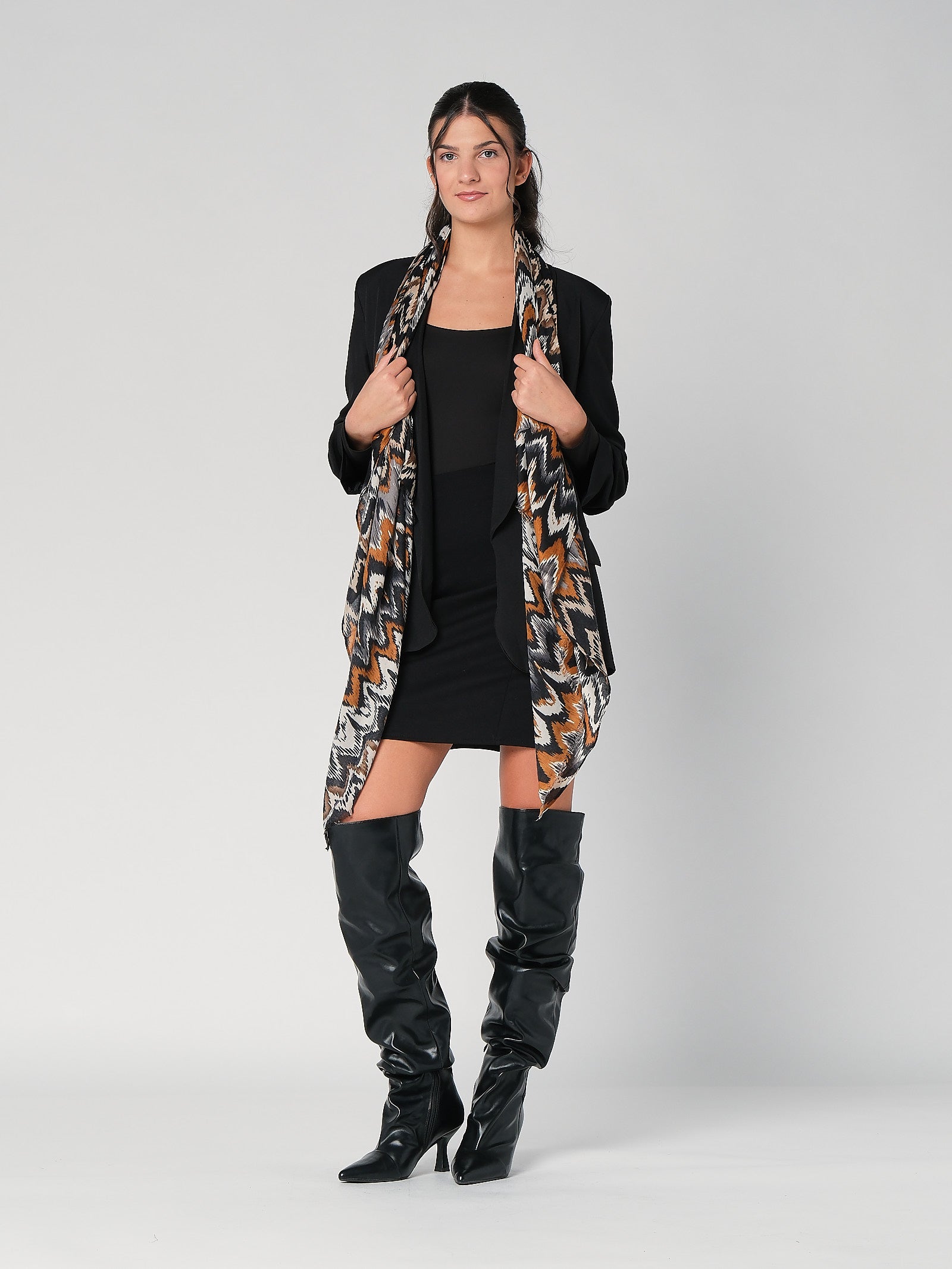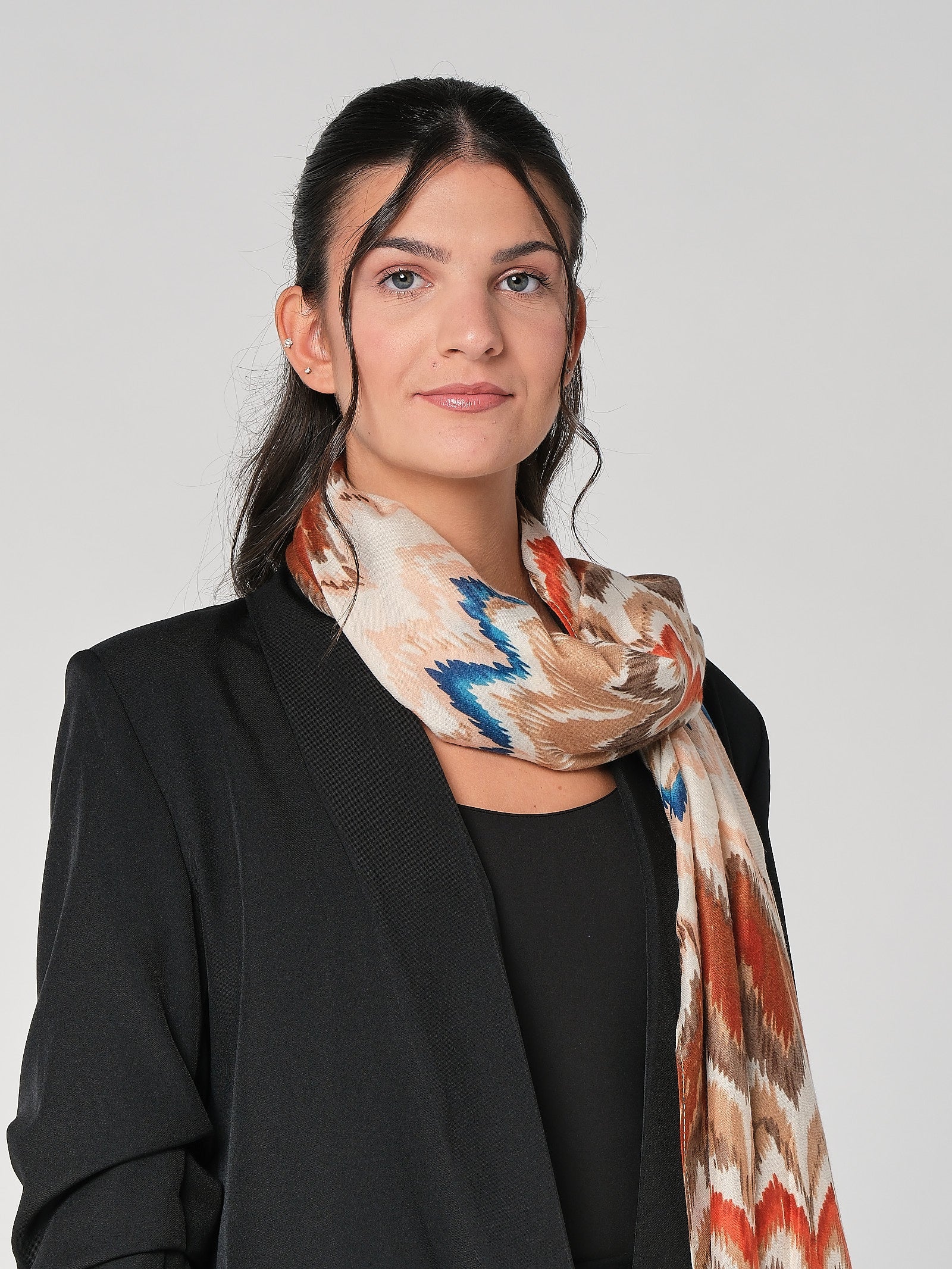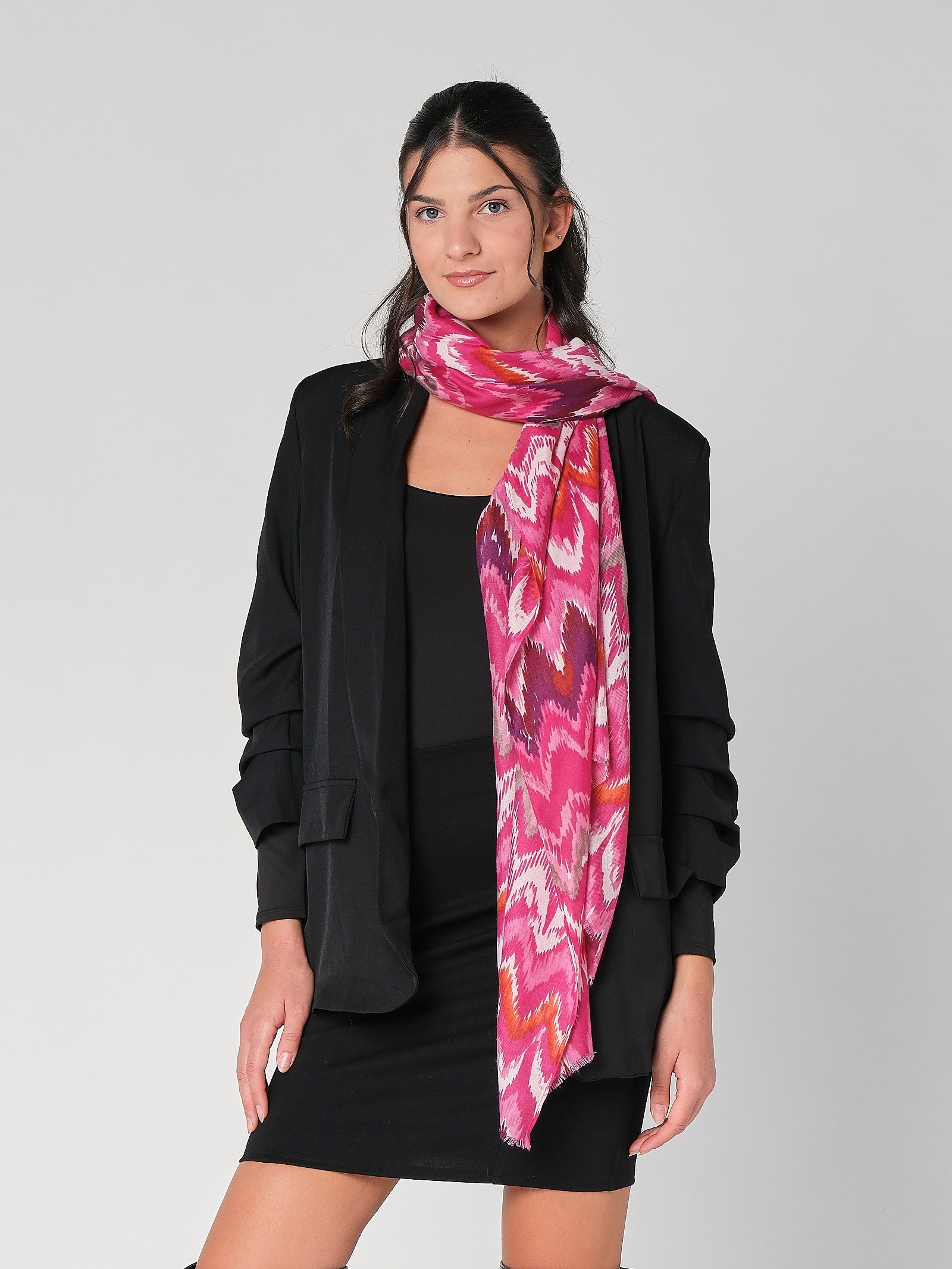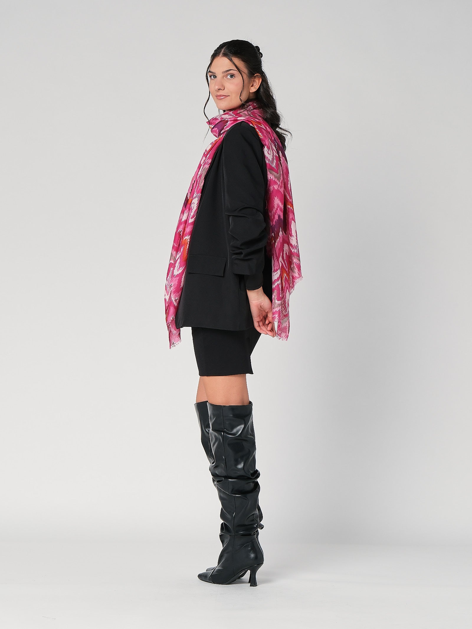 Pashmina dal design minimal e raffinato, perfetta per arricchire look casual chic o outfit eleganti. Morbida al tatto e facile da abbinare, diventa un must-have di stagione da portare sempre con sé.